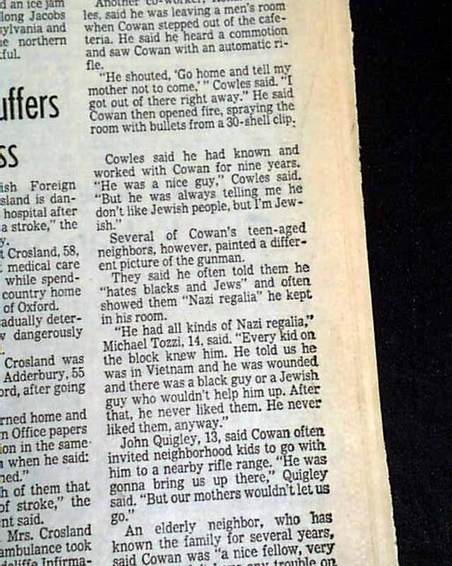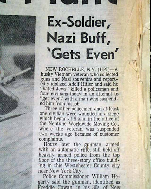 background: The 1977 New Rochelle mass killing occurred on February 14, 1977, when Frederick William Cowan, a 33-year-old suspended employee at Neptune Worldwide Moving Company in New Rochelle, New York, entered the office and warehouse armed with multiple guns and ammunition. Over the course of a shooting spree, he killed six people, including Officer Allen B. McLeod, who responded to the scene, and wounded several others; a later victim’s death brought the total fatalities to seven, including Cowan, who ultimately took his own life after a roughly 10-hour standoff with police. Investigations revealed that Cowan had been motivated by revenge against coworkers, and he held racist and antisemitic beliefs, along with a fascination with Nazi paraphernalia. The attack, one of the deadliest workplace shootings in New York at the time, left a lasting mark on the community, with Officer McLeod and the other victims later commemorated for their sacrifice.
