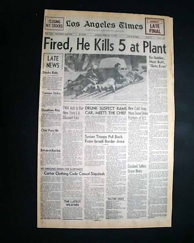 The front page has a banner headline: "Fired, He Kills 5 at Plant" with subhead and related photo. (see images) Nice for display.