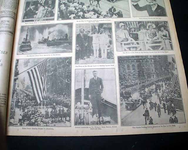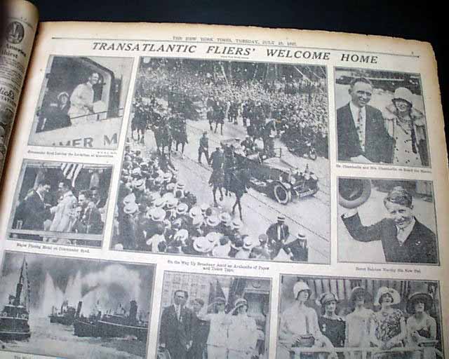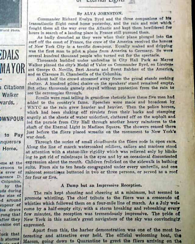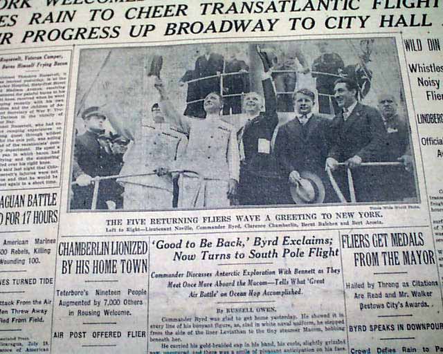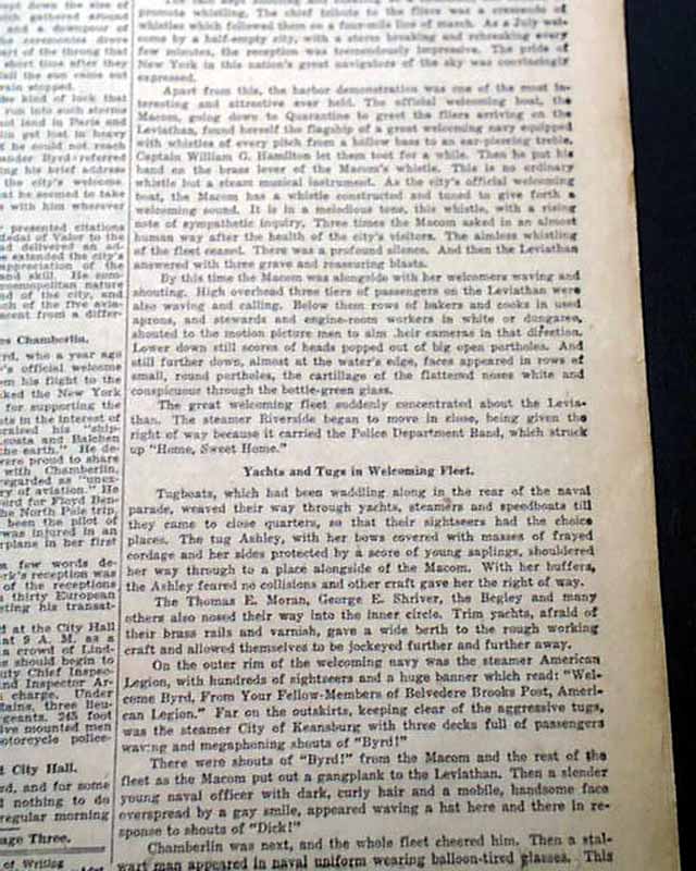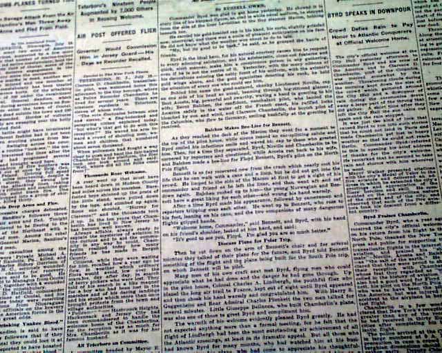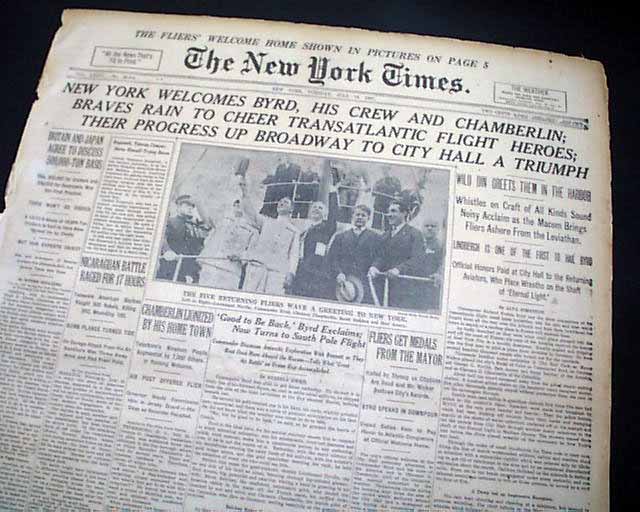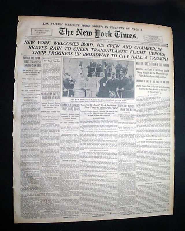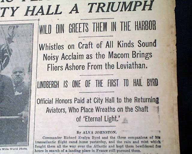 The top of the front page has a nice banner headline: "NEW YORK WELCOMES BYRD, HIS CREW AND CHAMBERLAIN; BRAVES RAIN TO CHEER TRANSATLANTIC FLIGHT HEROES; THEIR PROGRESS UP BROADWAY TO CITY HALL A TRIUMPH" with many subheads and photo. Much more inside with full page pictorial. Loads of text.