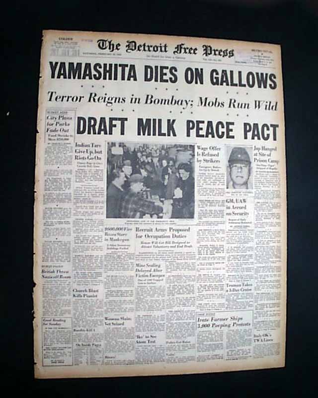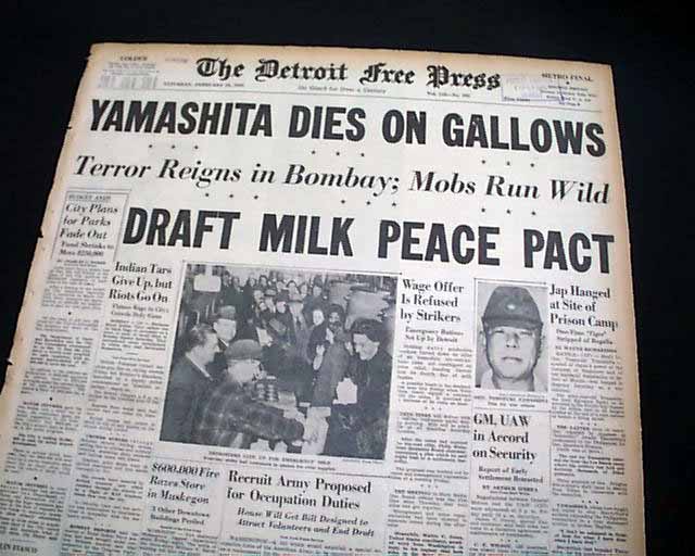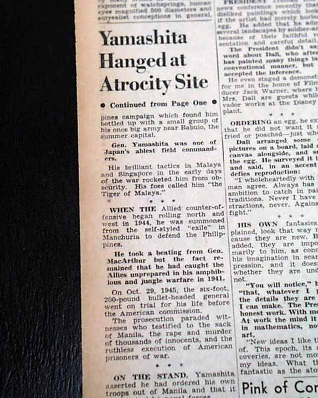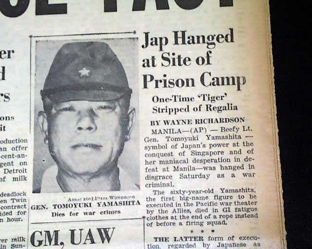 The front page has a nice banner headline: "YAMASHITA DIES ON GALLOWS" with subheads and photo. (see images)