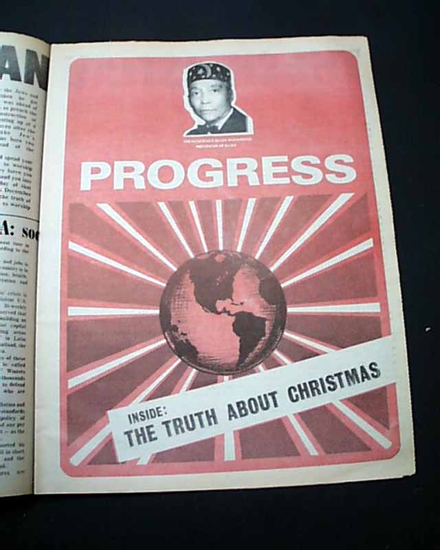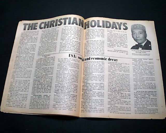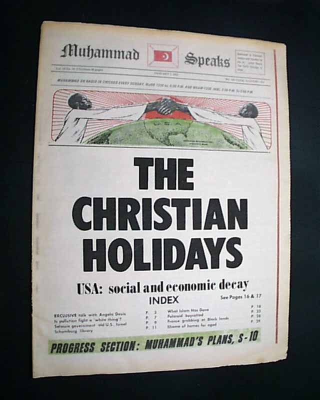 The bold banner headline reads: "THE CHRISTIAN HOLIDAYS" and in smaller heads: "USA: Social and Economic Decay". Other articles inside include: ""Exclusive Talk with Angela Davis" "Is Pollution Fight a 'White Thing'?" "What Islam Has done" and more.