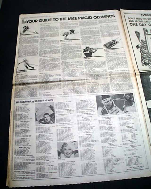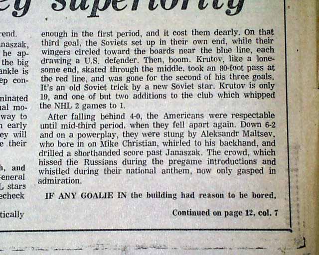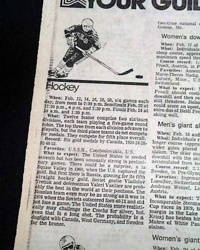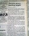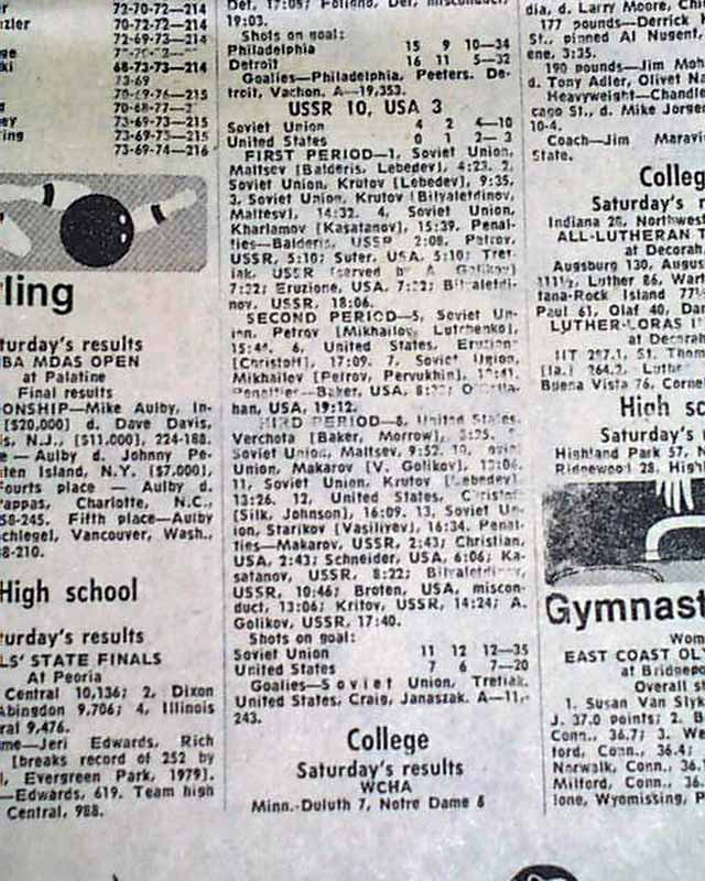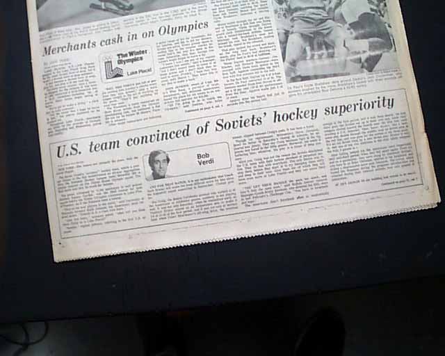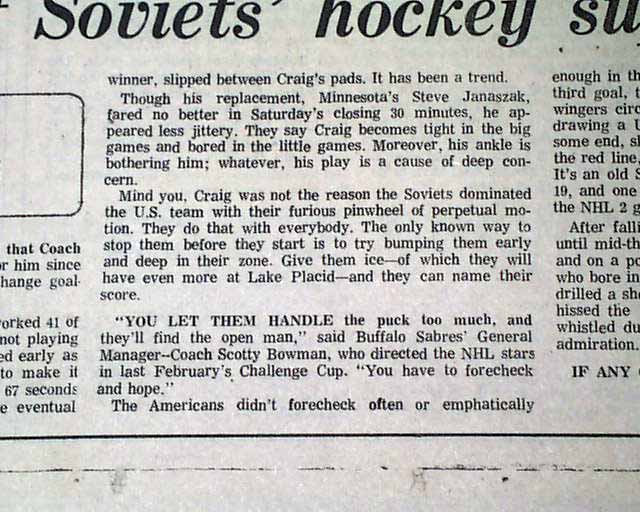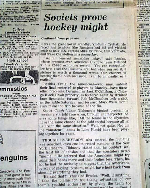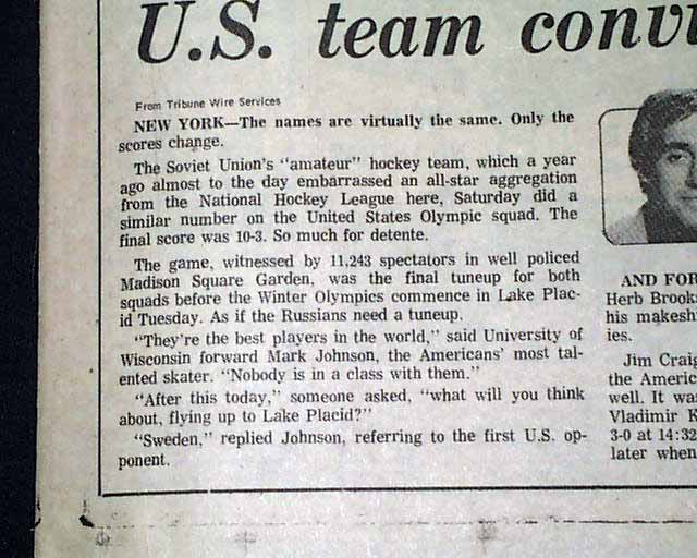 Near the bottom of the front page of the sport's section is a banner heading: "U.S. team convinced of Soviets' hockey superiority" A few more smaller related item inside this section with box scores. (see images) This drubbing by the Soviets set up the stage for the historic "Miracle on Ice" win by the United States hockey team shortly after.