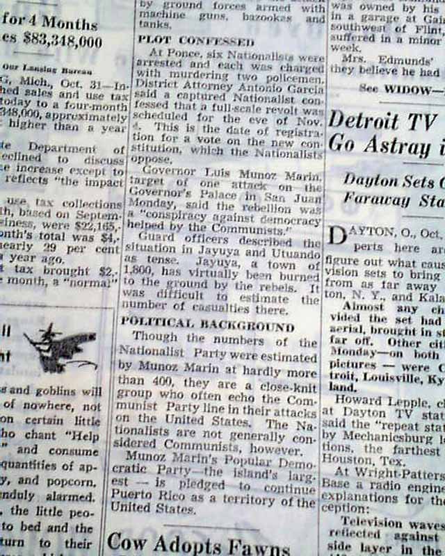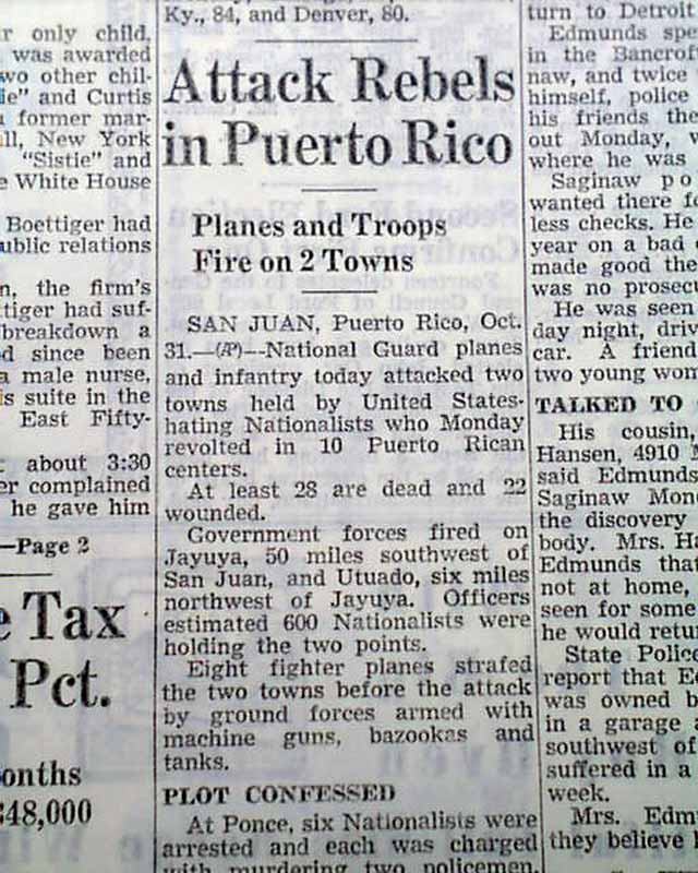 AI notes: On October 30, 1950, Puerto Rico experienced a violent uprising known as the Jayuya Uprising or the Puerto Rican Nationalist Revolt. Organized by the Puerto Rican Nationalist Party led by Pedro Albizu Campos, the revolt aimed to protest U.S. rule over the island and demand full independence. The rebellion began in several towns, most notably Jayuya and Utuado, where Nationalists seized control, raised the Puerto Rican flag (then illegal), and declared the island a free republic. The U.S. government responded with overwhelming force—deploying the National Guard, using machine guns and even air strikes to suppress the uprising. Dozens were killed or injured, and hundreds were arrested, including the movement’s leaders. Although quickly crushed, the revolt marked a pivotal moment in Puerto Rico’s independence struggle and led to intensified debate over the island’s political status, culminating two years later in the creation of the Commonwealth of Puerto Rico (Estado Libre Asociado) in 1952.