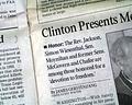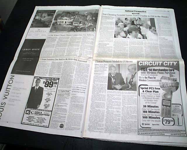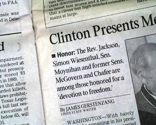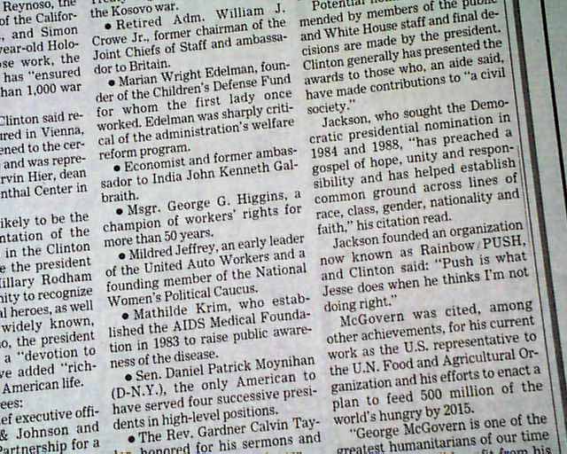 Page 5 has a heading: "Clinton Presents Medals to 15 Heroes" with subhead and related photo. Text includes: "Jackson, who sought the Democratic presidential nomination in 1984 and 1988, 'has preached a gospel of hope..." (see images)