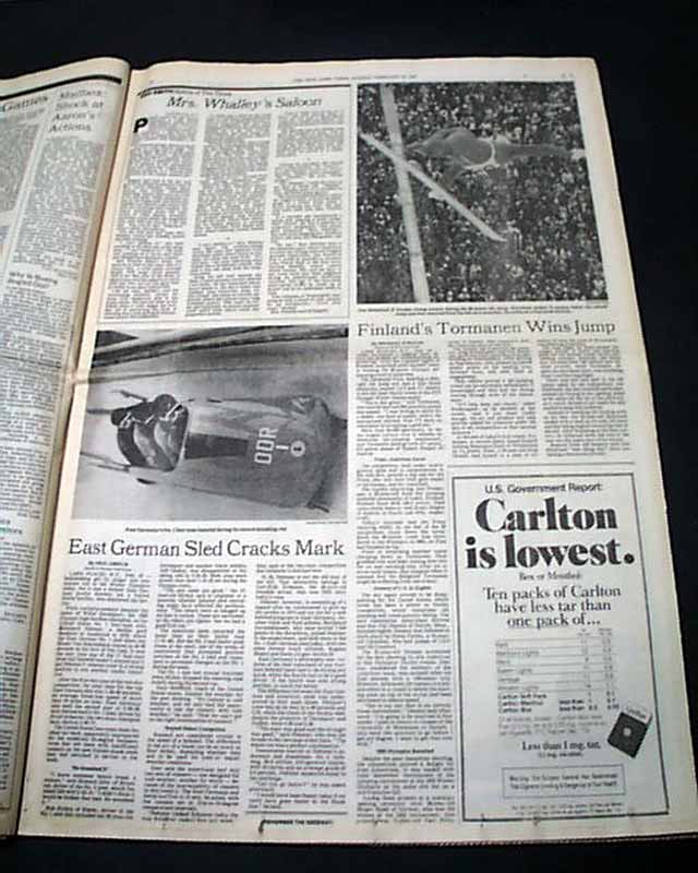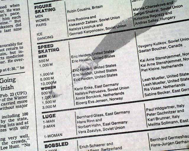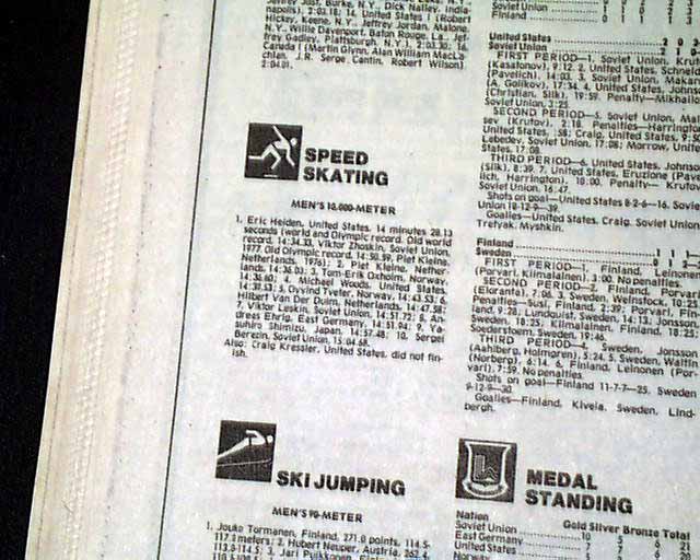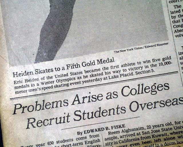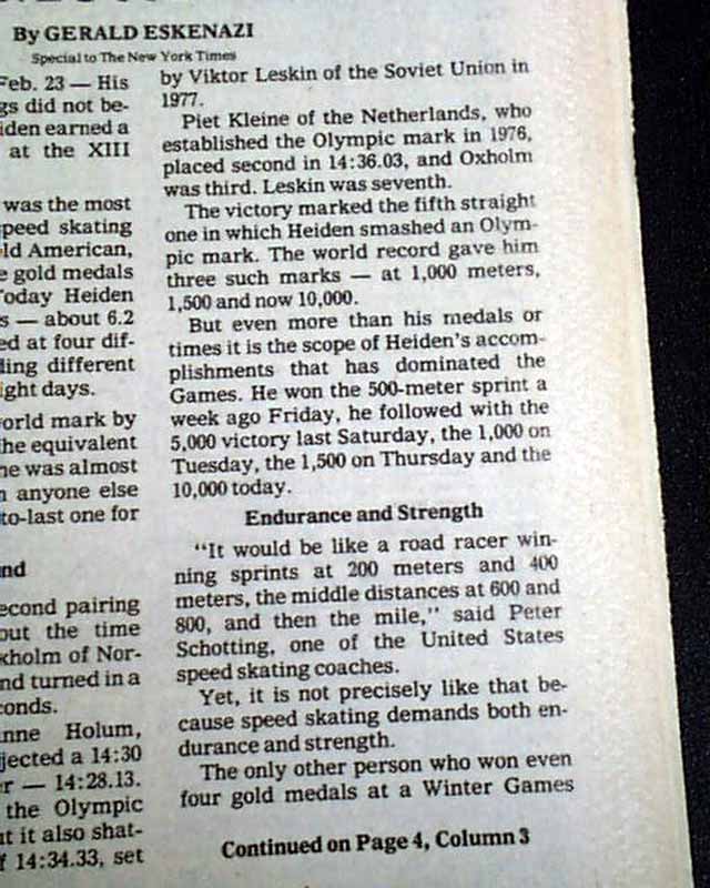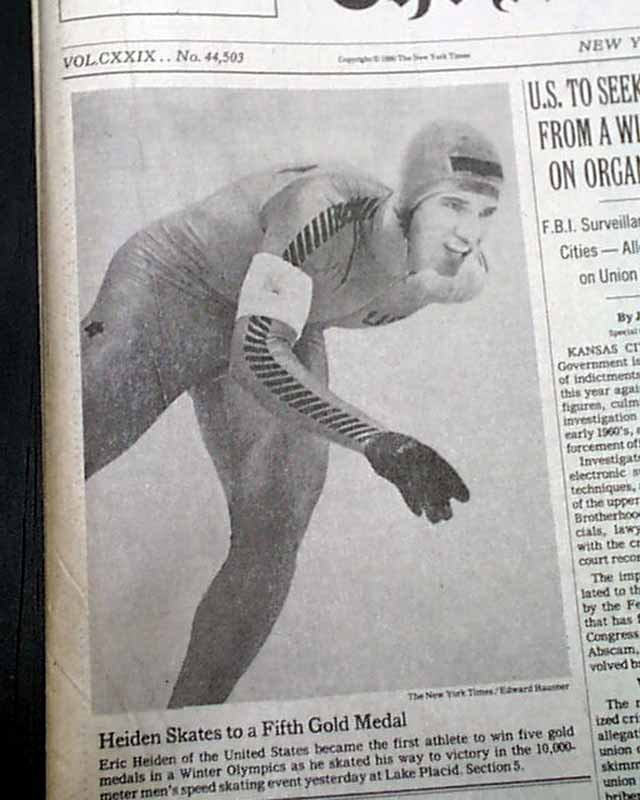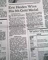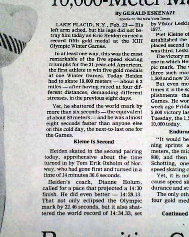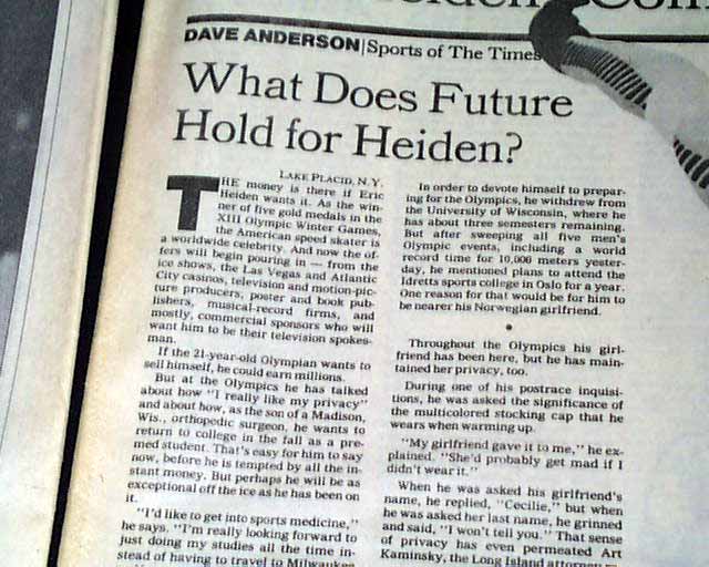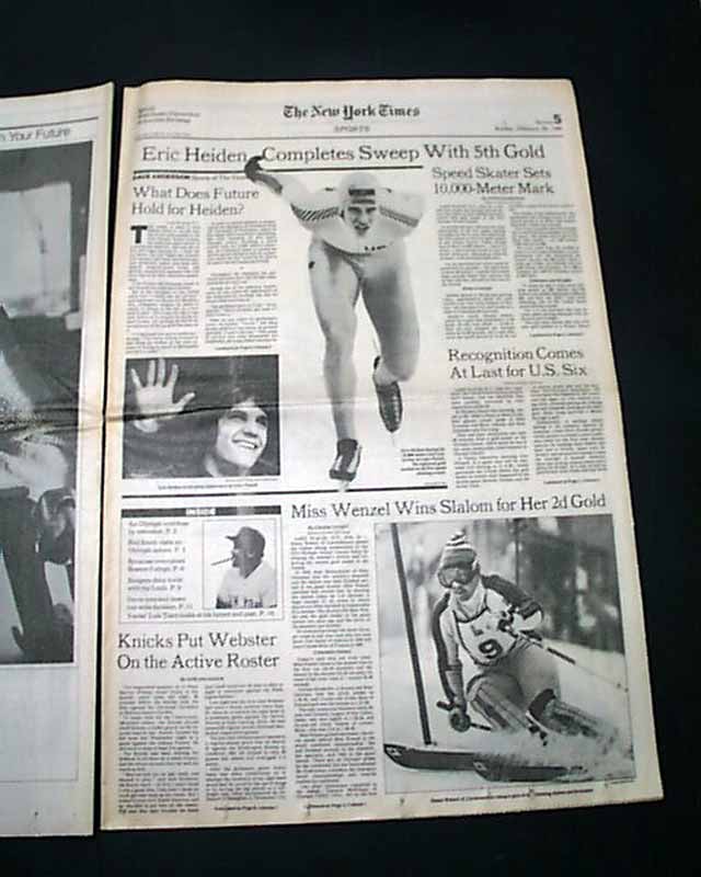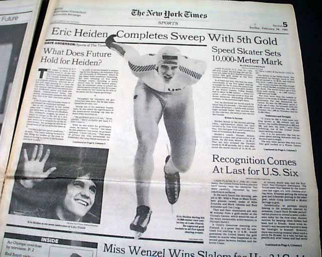 The front page has a two column photo with small heading: "Heiden Skates to a Fifth Gold Medal" The front page of the sport's section has a banner headline: "Eric Heiden Completes Sweep With 5th Gold" with subhead and two related photos. (szee images)