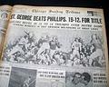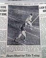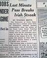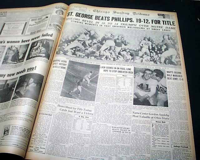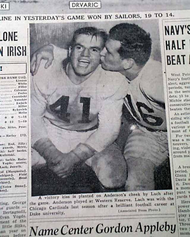 The front page has a five column heading: "Sailors Defeat Notre Dame, 19-14" with subhead. The front page of the sport's section has a banner heading: "SAILORS REVEL IN 19 TO 14 TRIUMPH OVER NOTRE DAME" with subheads, lineups and 3 related photos, one being a very large action photo. (see images)