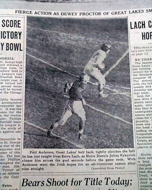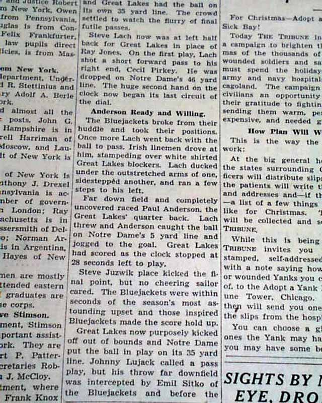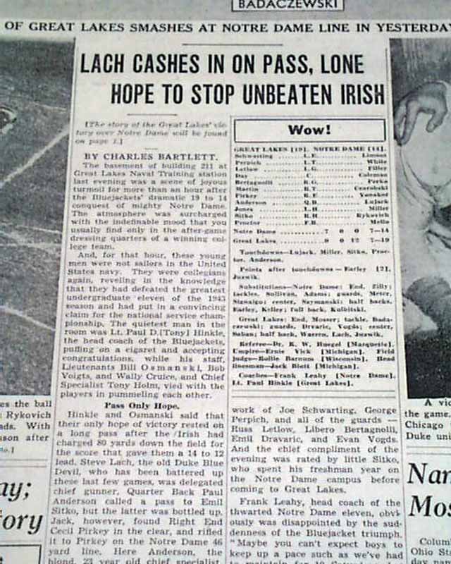 background: In a dramatic late‑season clash on November 27, 1943, the Great Lakes Navy Bluejackets, a World War II service team composed of former college and professional stars stationed at the U.S. Naval Training Station, pulled off one of the biggest upsets in college football history by defeating the previously undefeated and No. 1–ranked Notre Dame Fighting Irish, 19‑14, at Ross Field in Illinois. Notre Dame had dominated through the season at 9‑0, but in the closing minutes of the game, Great Lakes quarterback Steve Lach launched a decisive pass to Paul Anderson, who ran it into the end zone for the go‑ahead touchdown; the successful extra point sealed the victory. The upset stunned fans and sportswriters alike, with some calling it the most surprising result of the year, and highlighted the exceptional strength of military service teams during the war, which could field top-level talent from across the country. Despite the loss, Notre Dame still finished the season ranked No. 1 and claimed the national championship, while Great Lakes ended the year 10‑2 and ranked No. 6, cementing the game as a legendary moment in wartime football history.