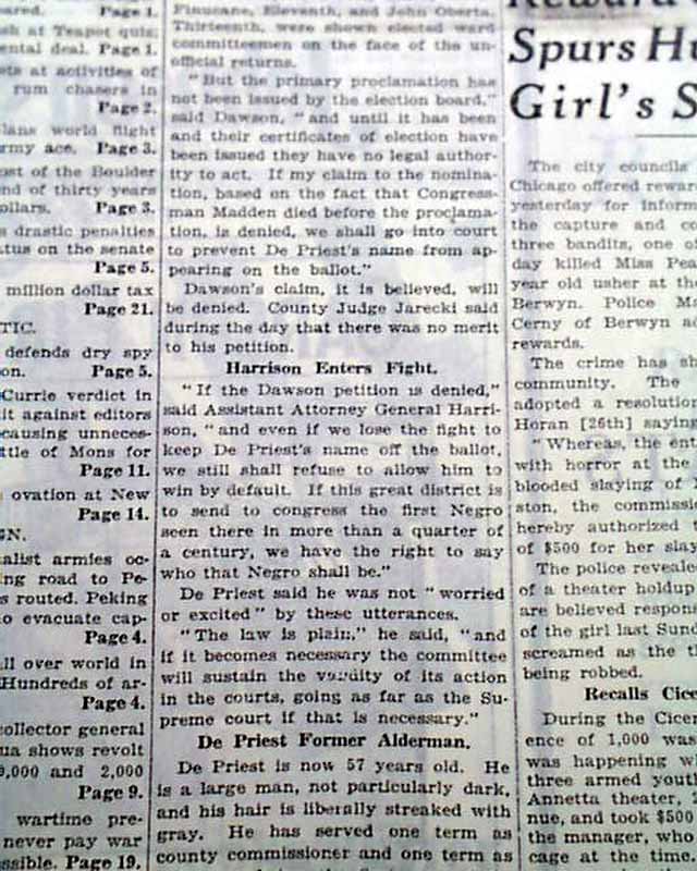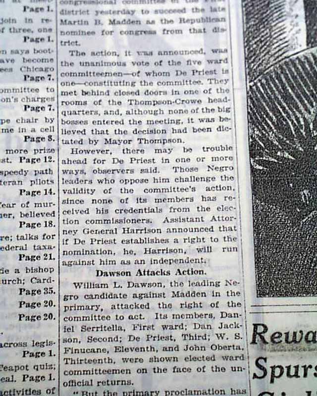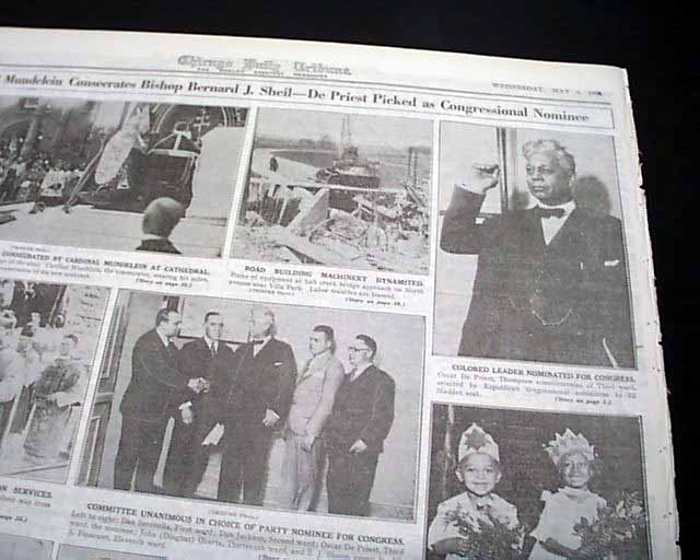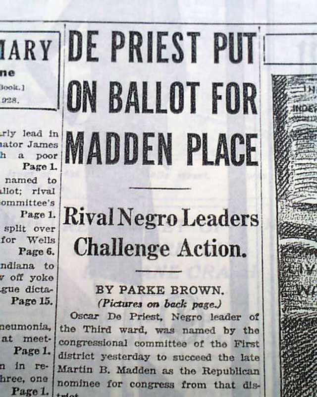 The front page has a one column heading: "DE PRIEST PUT ON BALLOT FOR MADDEN PLACE" with subhead. And a photo of him on the back page with heading. (see images) He would become the 1st African American elected to Congress in the 20th century. Probably only reported in a Chicago publication, extremely rare as such.
