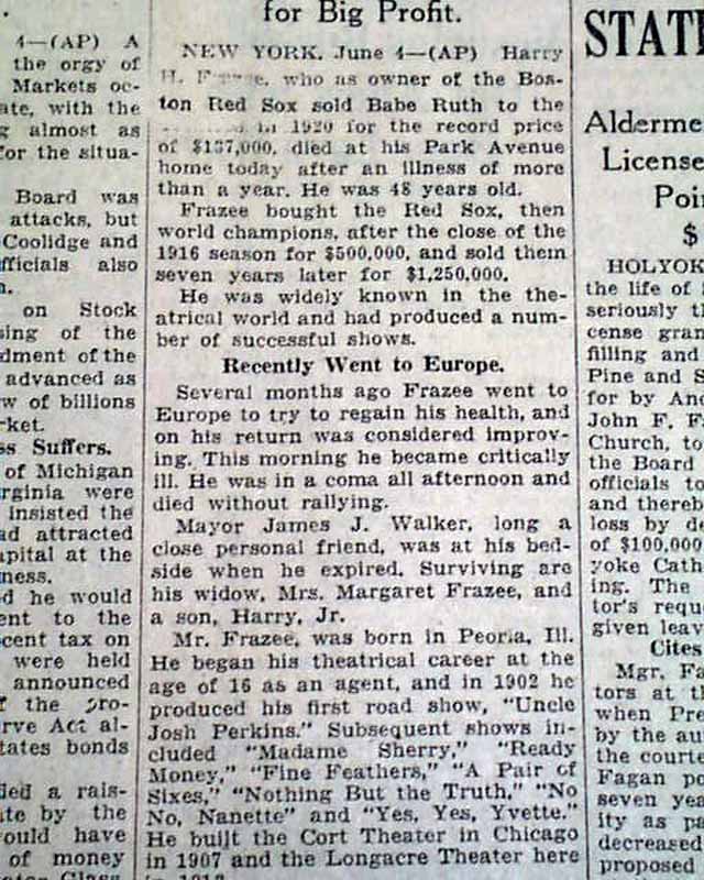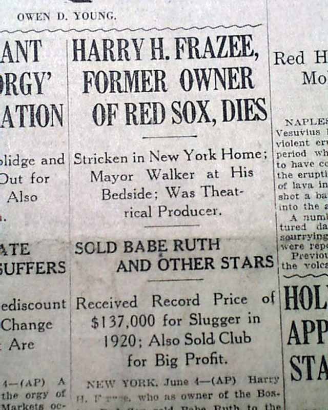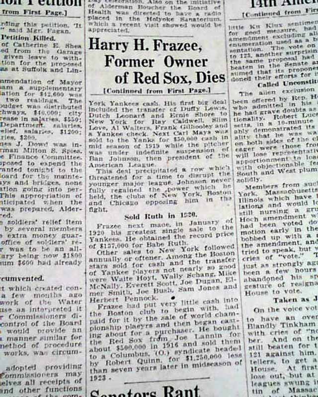 The front page has a one column heading: "HARRY H. FRAZEE, FORMER OWNER OF RED SOX, DIES" with subhead. (see images)  He was best known for selling Babe Ruth to the Yankees thus starting the Curse of the Bambino.