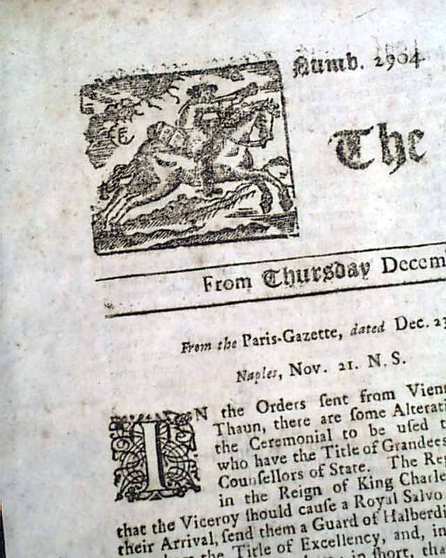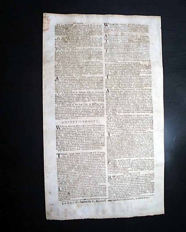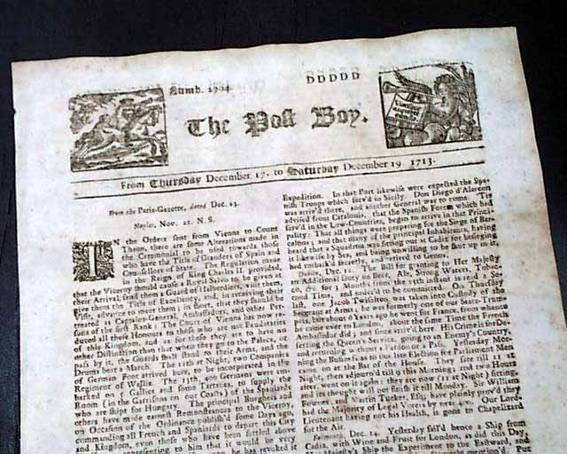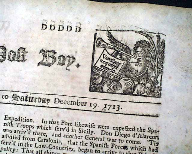It began publication in 1695, & was a single-sheet folio newspaper, printed on both sides, carrying a mix of foreign news (especially European wars, treaties, and royal affairs), English news, advertisements, & legal notices. A prime & displayable feature is the ornate, decorative masthead, which includes engravings of a post boy (messenger on horseback) and an angelic figure "trumpeting" the news, making it a visually striking and collectible newspaper.