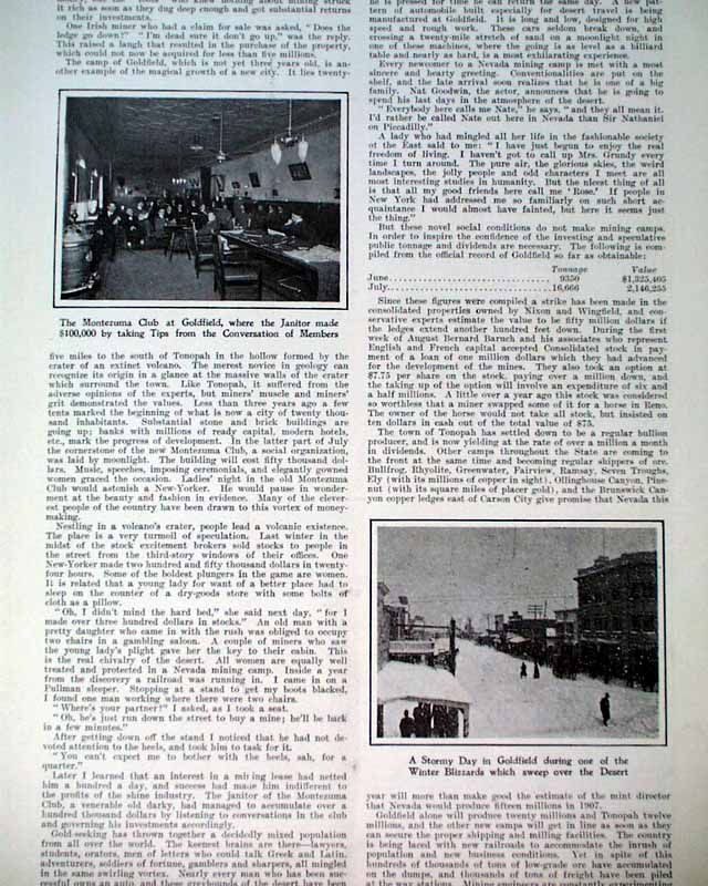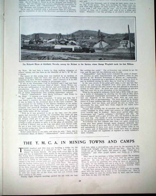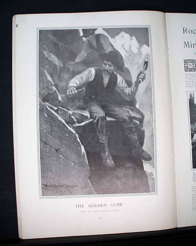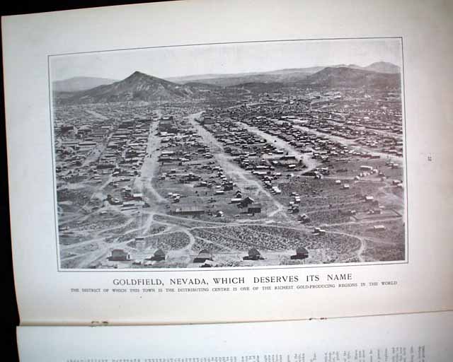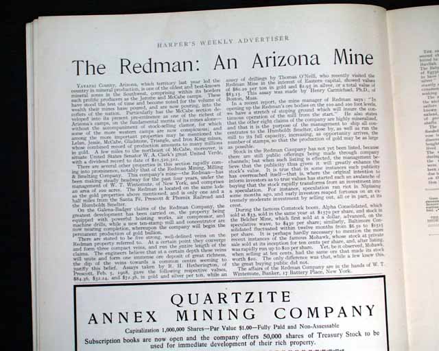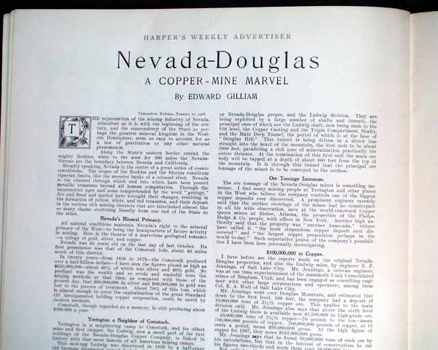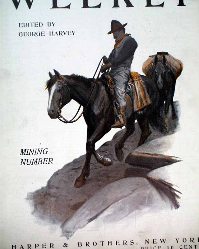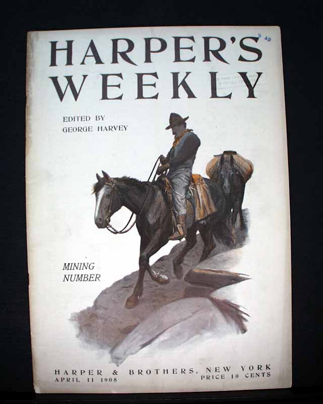 HARPER'S WEEKLY--"Mining Number", New York, April 11, 1908 (with color cover) See the photos for the nice color cover which features a miner on horseback. The issue contains much reporting on "Nevada's Safeguard for Mine-buyers" which includes several photos of Goldfield, Nevada, plus a fullpg. with 5 photos of: "How Goldfield Guards Her Treasures". There are also articles on Tonopah, Bullfrog, Fairview and Cobalt. There is also a terrific fullpg. photo of: "Goldfield, Nevada" (see). And a nice doublepg. centerfold by famed artist James Montgomery Flagg (see). Never bound nor trimmed, great condition.