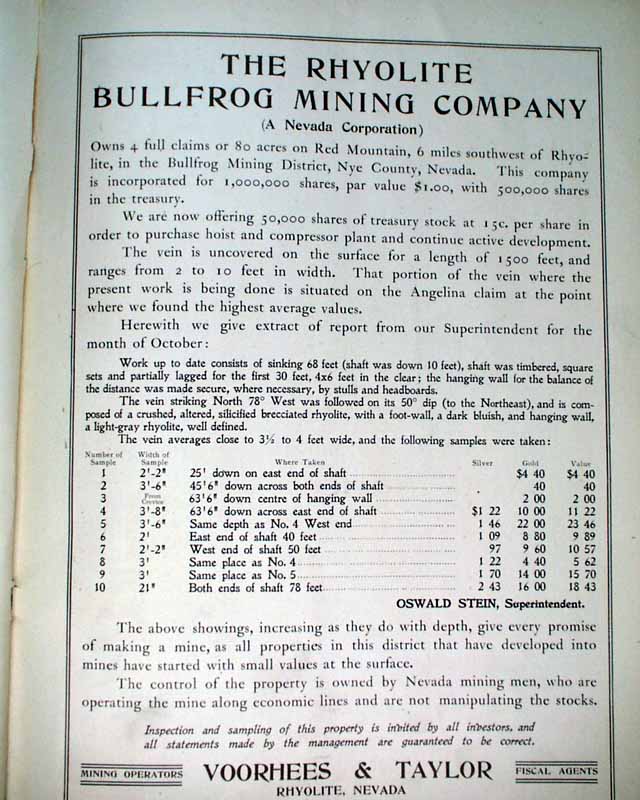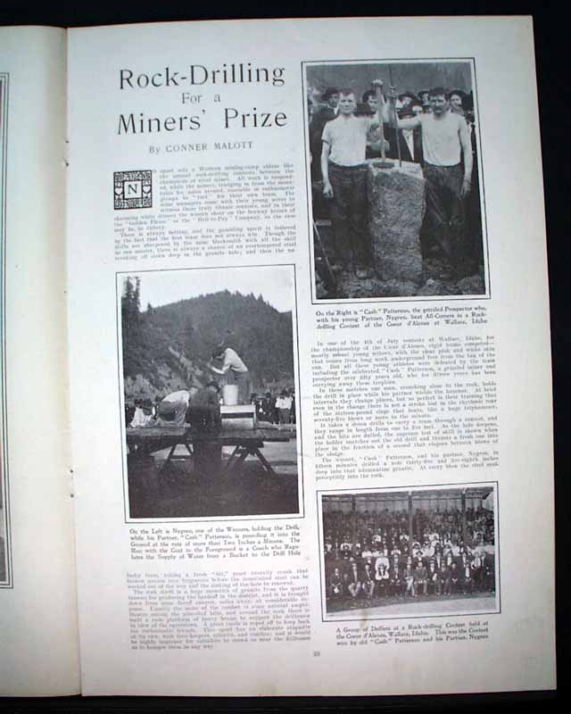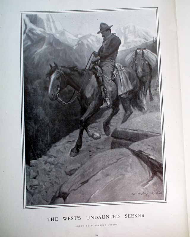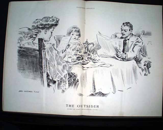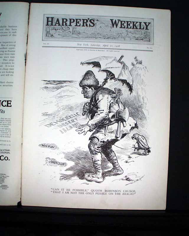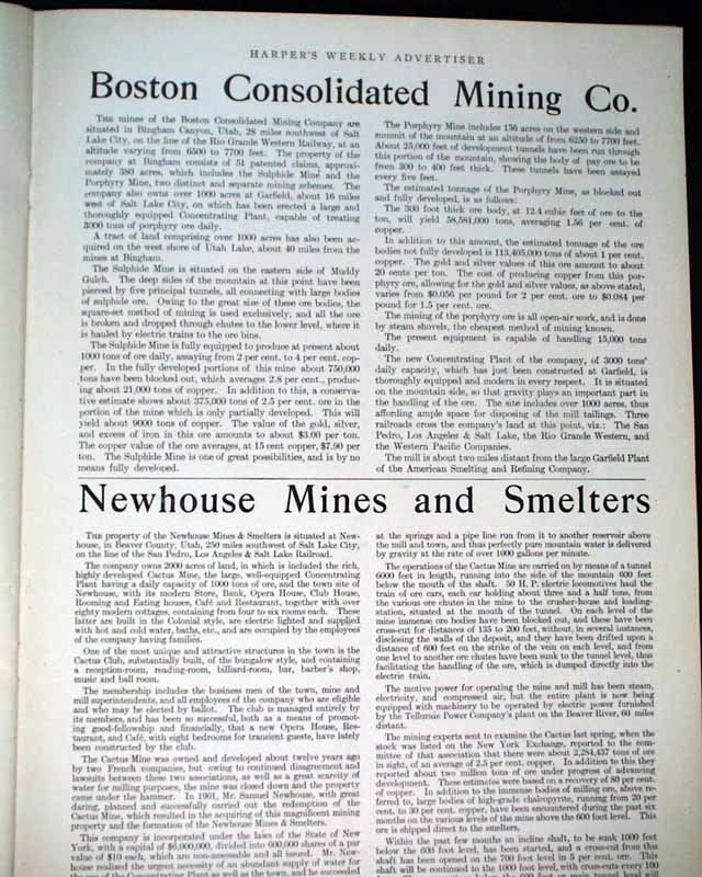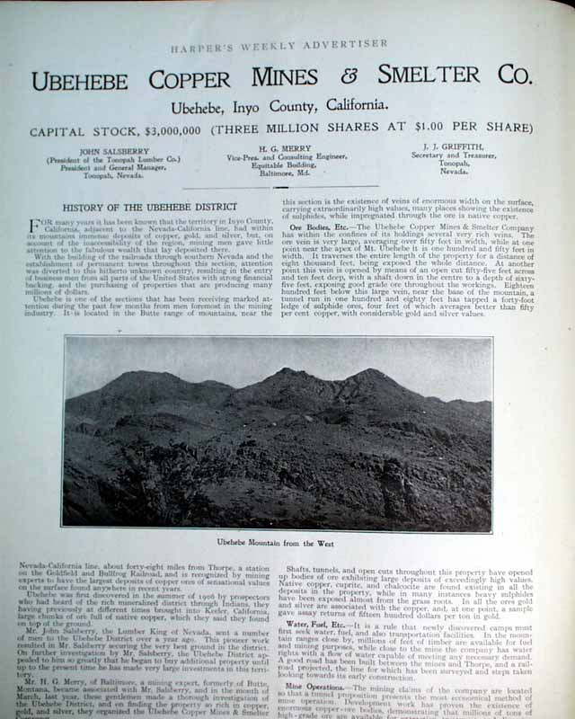 HARPER'S WEEKLY--"Mining Number", New York, April 11, 1908 (with color cover) See the photos for the nice color cover which features a miner on horseback. The issue contains much reporting on "Nevada's Safeguard for Mine-buyers" which includes several photos of Goldfield, Nevada, plus a fullpg. with 5 photos of: "How Goldfield Guards Her Treasures". There are also articles on Tonopah, Bullfrog, Fairview and Cobalt. There is also a terrific fullpg. photo of: "Goldfield, Nevada" (see). And a nice doublepg. centerfold by famed artist James Montgomery Flagg (see). Never bound nor trimmed, great condition.