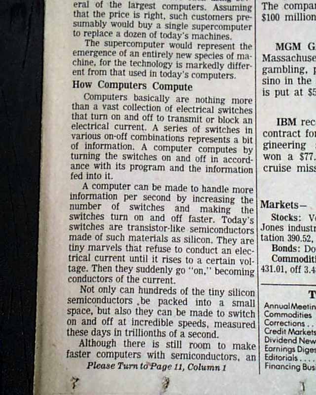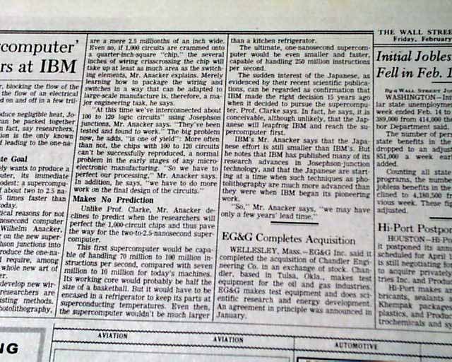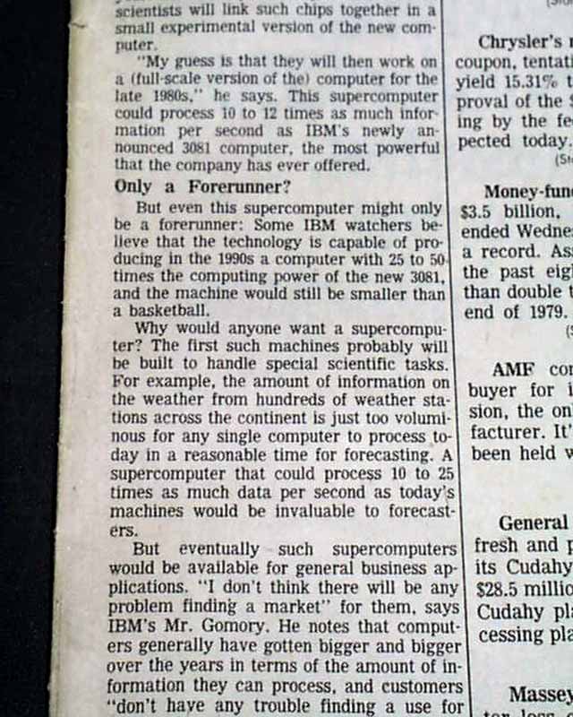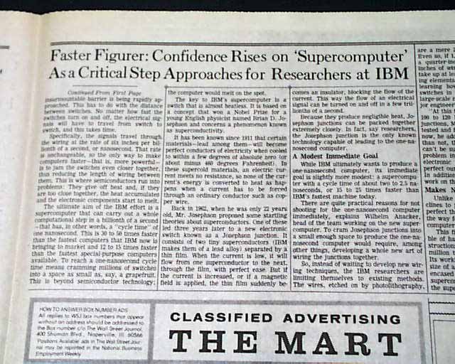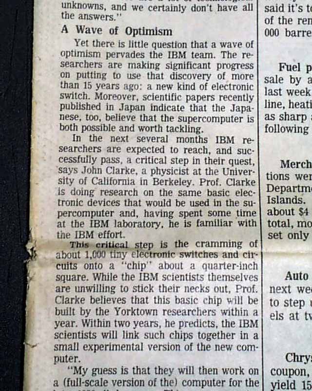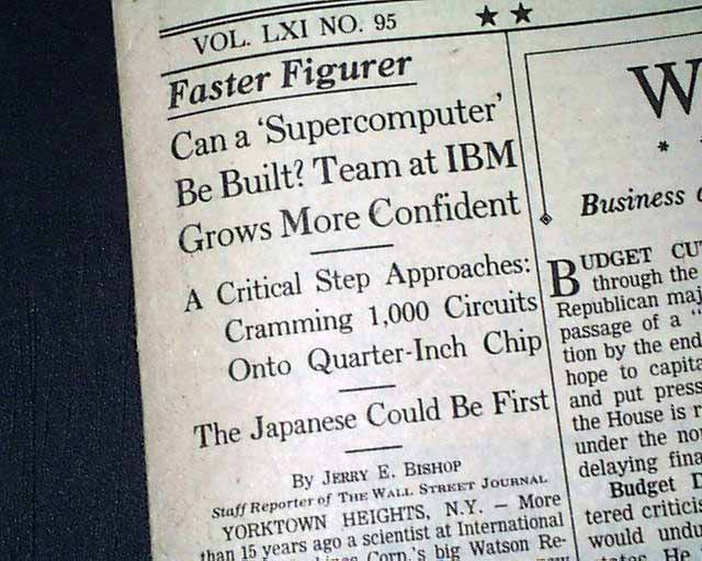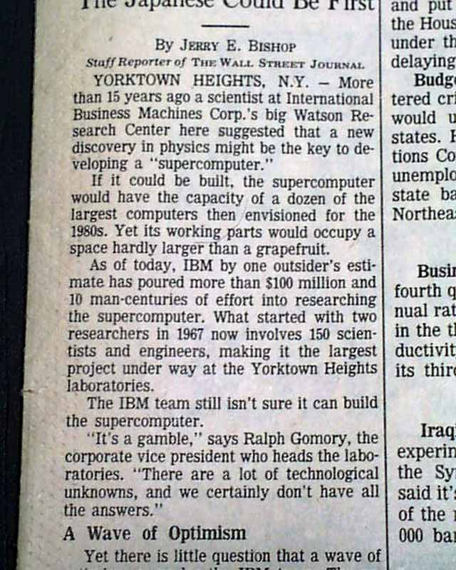 The top of front page has a one column heading: "Can a 'Supercomputer' Be Built? Team at IBM Grows More Confident" with lead-in: "Faster Figurer" and subheads. (see images)