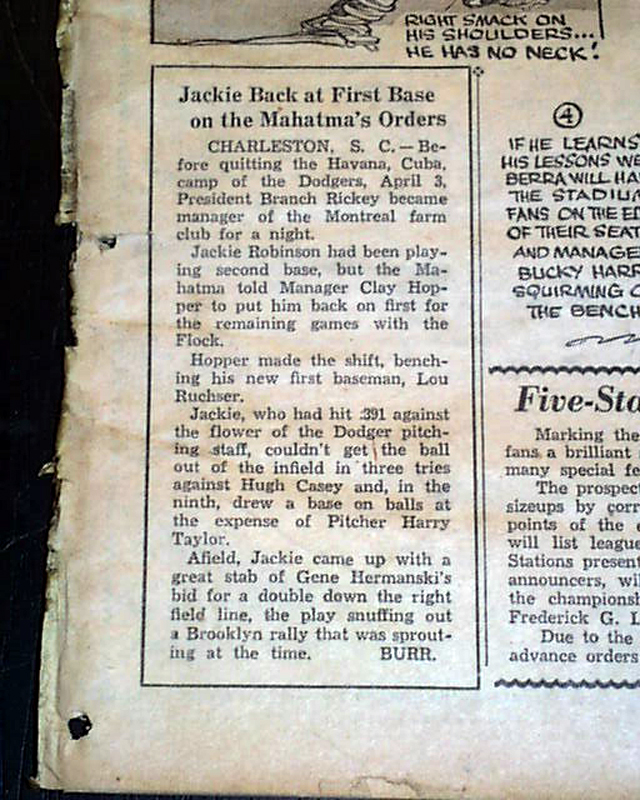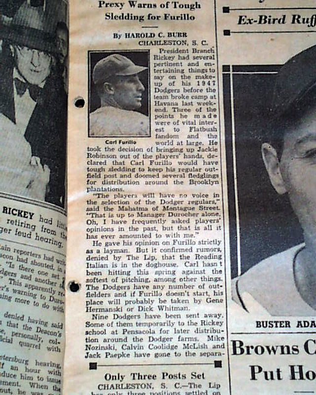 The article notes in part: "...He took the decision of bringing up Jackie Robinson out of the players' hands, declared that Carl Furillo would have tough sledding to keep his regular outfield post & doomed several fledglings for distribution around the Brooklyn plantations...".