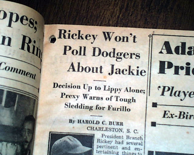 THE SPORTING NEWS, St. Louis, April 9, 1947 Page 7 has an article: "Rickey Won't Poll Dodgers About Jackie", "Decision Up to Lippy Alone...".