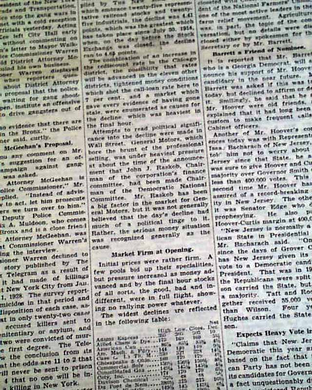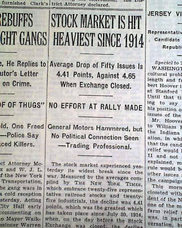 The ftpg. has a report: "Stock Market Is Hit Heaviest Since 1914" "Average Drop of Fifty Issues is 4.41 Points..." "No Effort at Rally Made" "General Motors Hammered...". This this a prelude to the Great Stock Market Crash of 1929?