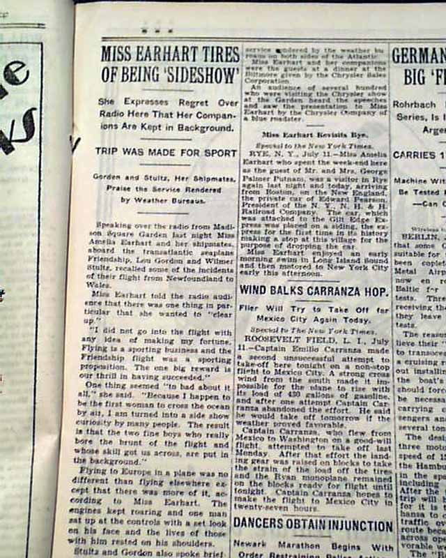 NEW YORK TIMES, July 12, 1928  Page 9 has a one column headings: "MISS EARHART TIRES OF BEING 'SIDESHOW'" "She Expresses Regret Over Radio Here That Her Companion Are Kept in Background" and more, reporting on Amelia Earhart being relentlessly pursued by the media after her famous flight across the Atlantic.