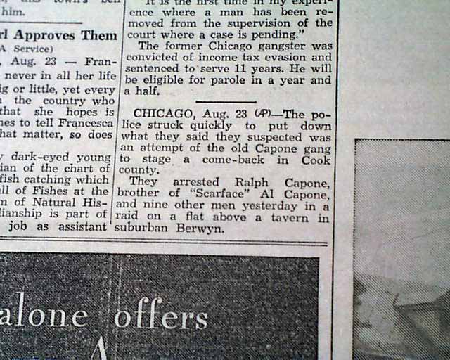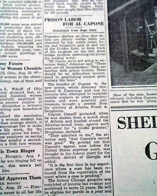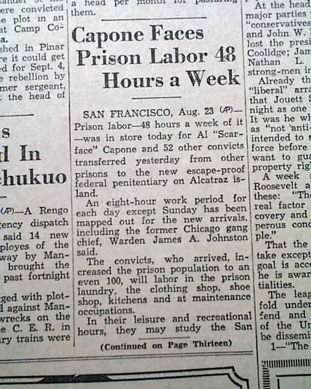 Near the bottom of the front page is a one column heading: "Capone Faces Prison Labor 48 Hours a Week" (see images)