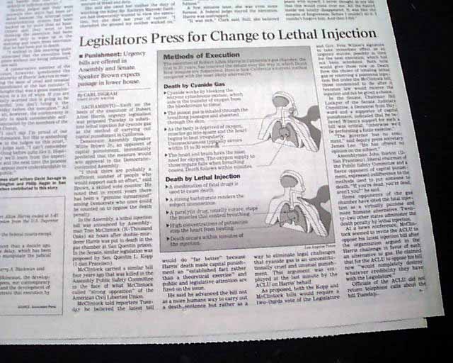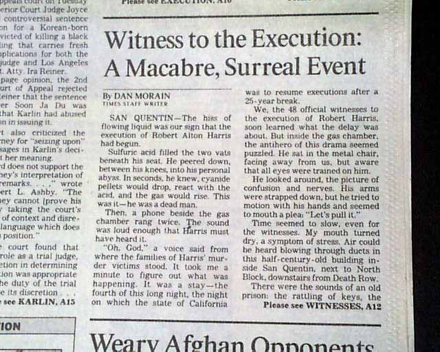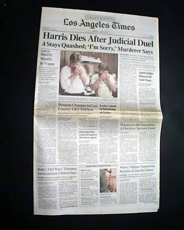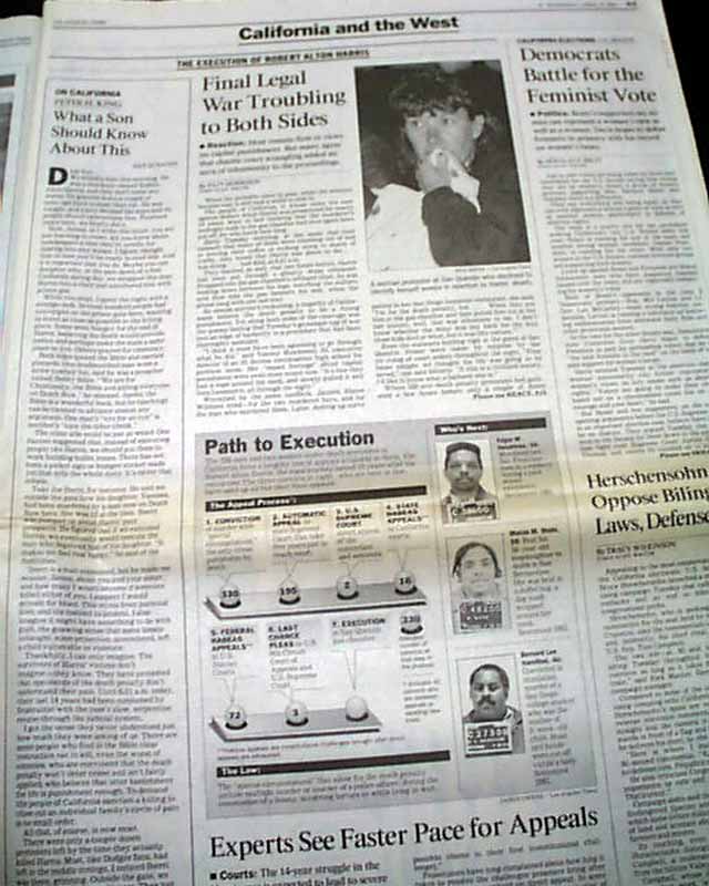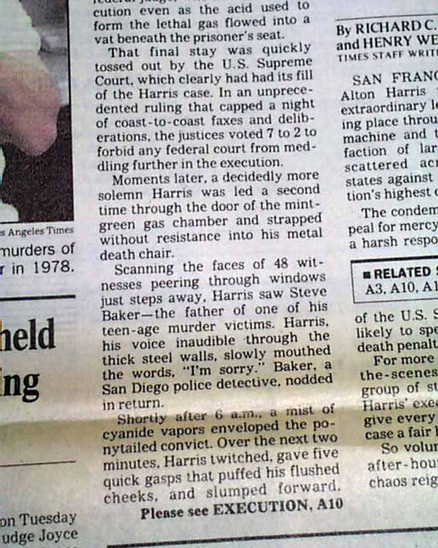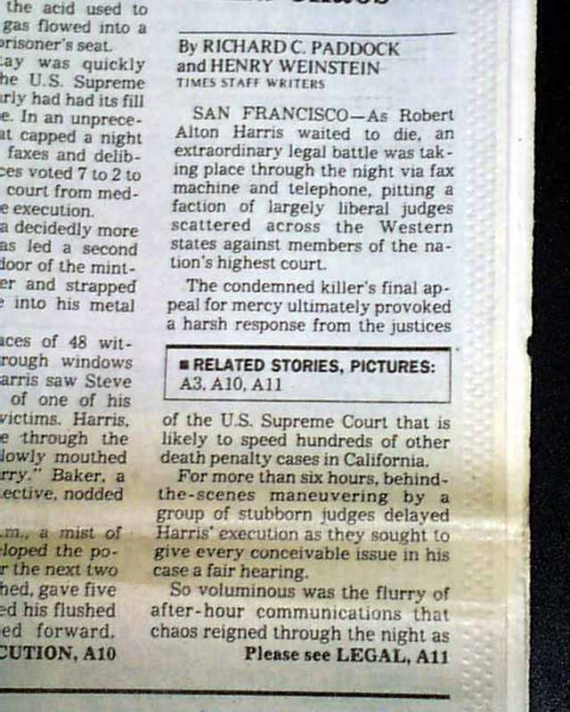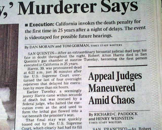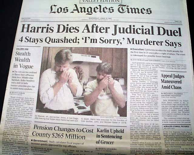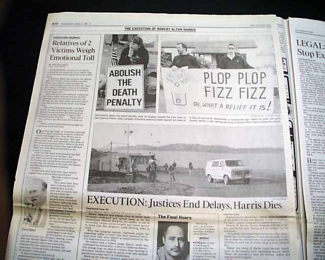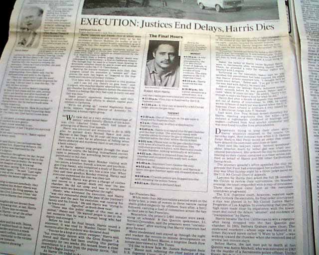 The front page has a nice banner headline: "Harris Dies After Judicial Duel; 4 Stays Quashed; 'I'm Sorry,' Murderer Says" with subheads and related photo. Much more inside, loads of text.