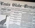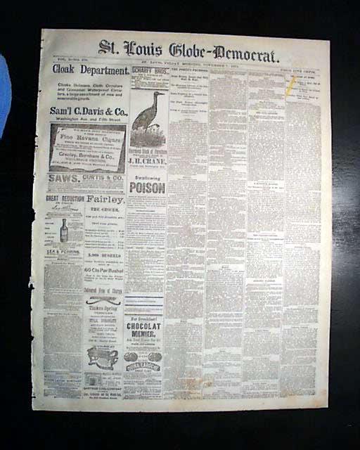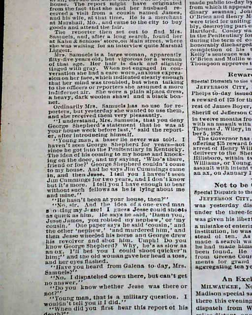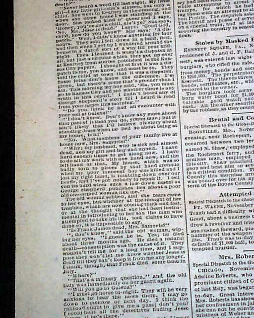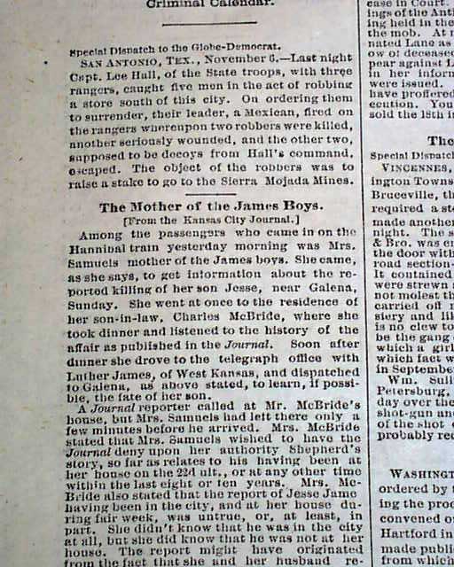 ST. LOUIS GLOBE-DEMOCRAT, Nov. 7, 1879  The top of pg. 2 has column heads: "RIDDLED BY RANGERS" "A Pitched Battle in Which Two Robbers Were Killed" "The Aged Mother of the James Boys Interviews". The interview with Jesse James' mother takes almost a full column.