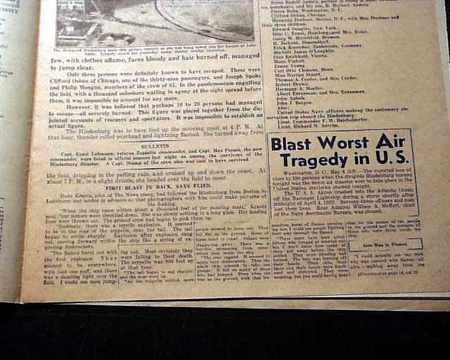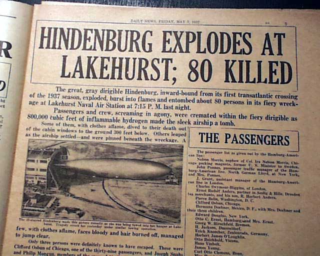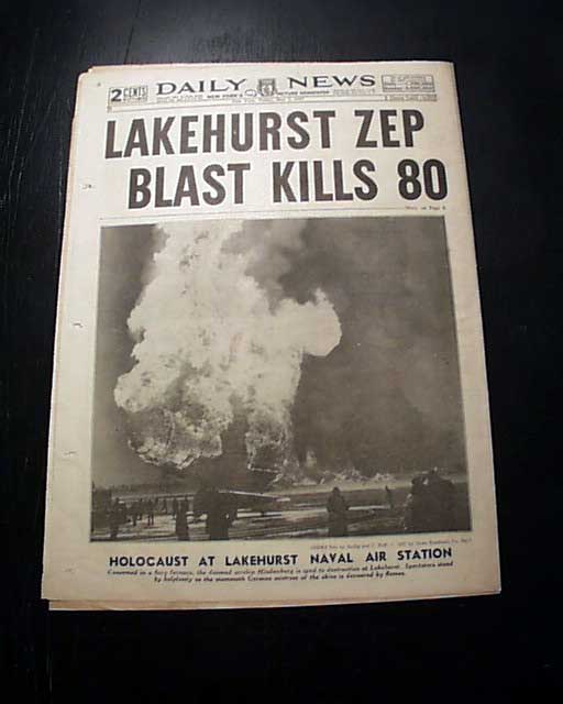 DAILY NEWS, New York, May 7, 1937  The front pages tells it all, with the bold banner headline: "HINDENBURG EXPLODES" and smaller subhead: "80 Die In flaming Zep" with half of the front page taken up with the famous & iconic photo of the dirigible "Hindenburg" seconds after it burst into flames. As the front page notes: "Another Picture of Disaster On Back Page" which could serve as another front page, having its own masthead & dateline with banner head: "LAKEHURST ZEP BLAST KILLS 80" with an even larger photo of the "Holocaust at Lakehurst Naval Air Station".
