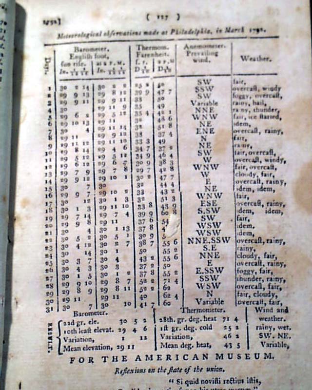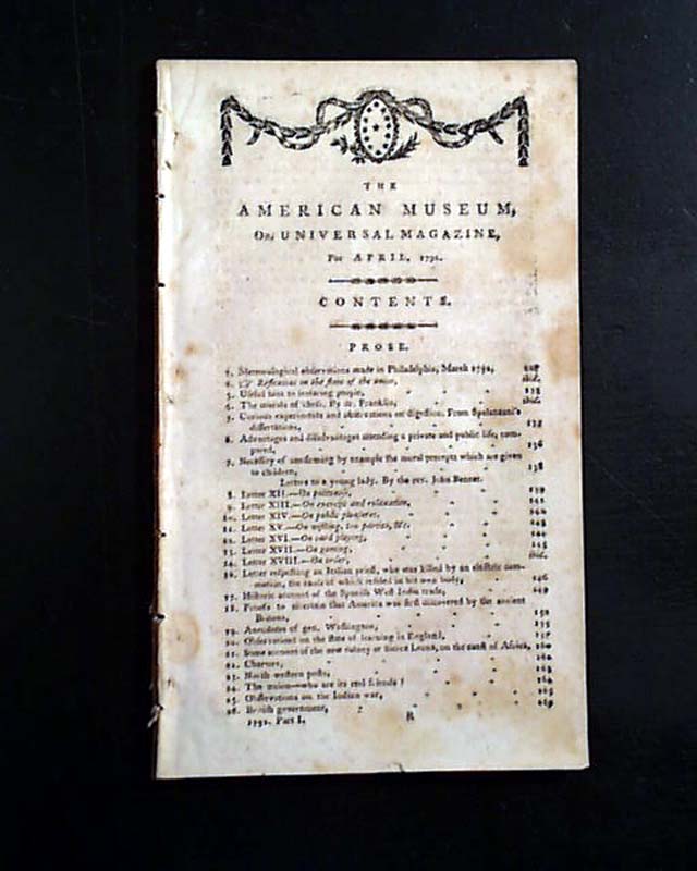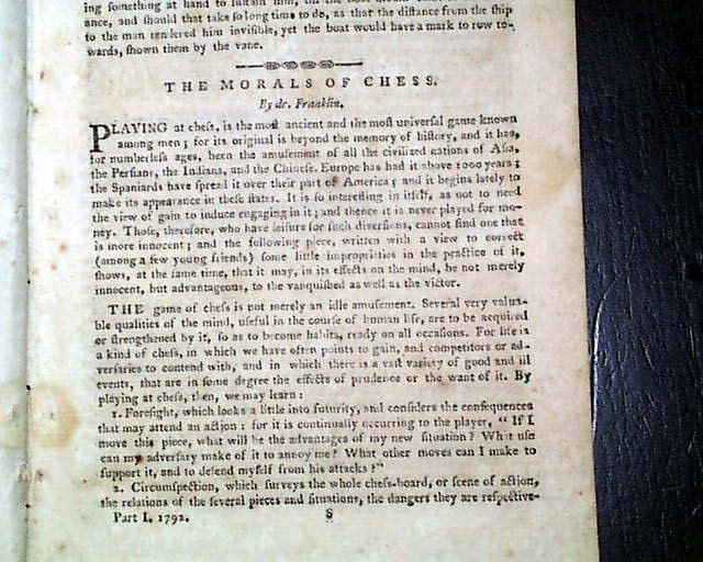 Item # 724609 THE AMERICAN MUSEUM, Philadelphia, April, 1792  By far the most significant content is the historic/collectible essay: "The Morals of Chess. By Dr. Franklin", which takes 2 1/2 pages. Note: This essay was first printed in the Columbian Magazine in the Dec. 1786 issue. Regardless, this contemporary printing is among the few publications which printed the essay which is highly desirable among those who collect items related to the history of chess. More can be read about the essay by doing a quick internet search for The Morals of Chess.