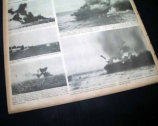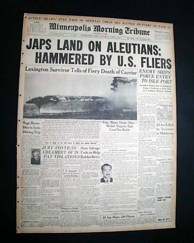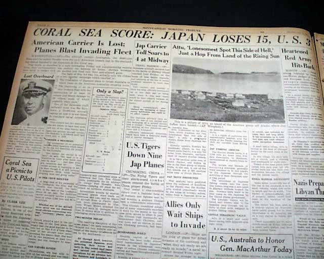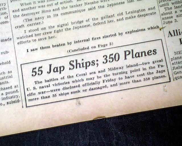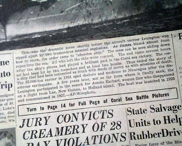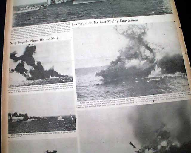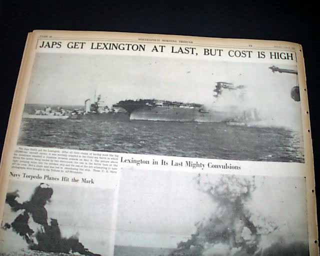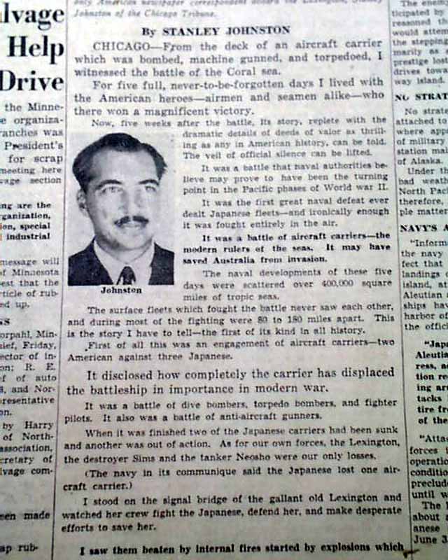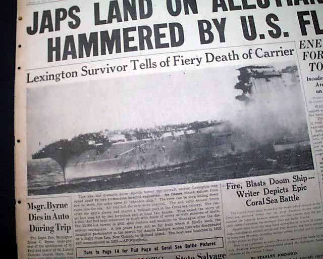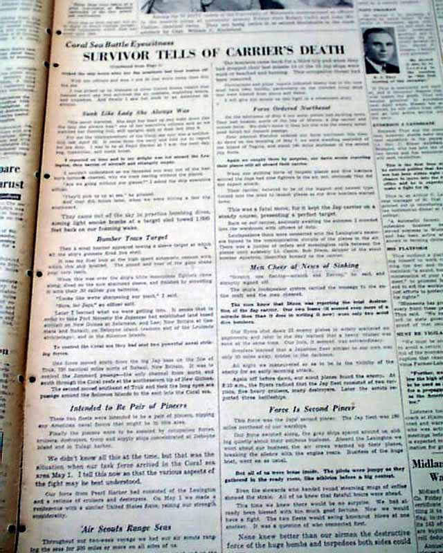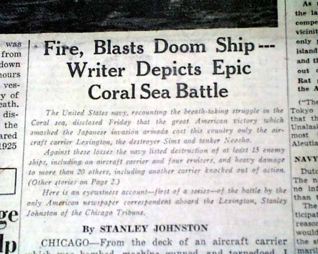 The front page has a very nice six column photo showing navy sailors jumping off the stricken USS Lexington during the Battle of the Coral sea with heading: "Lexington Survivor Tells of Fiery Death of Carrier" with subhead. this is a eyewitness account by Chicago Tribune journalist Stanly Johnston. More on pages 2 & 3. And to top things off, there is a full back page pictorial with banner heading: "JAPS GET LEXINGTON AT LAST, BUT COST IS HIGH" (see images)