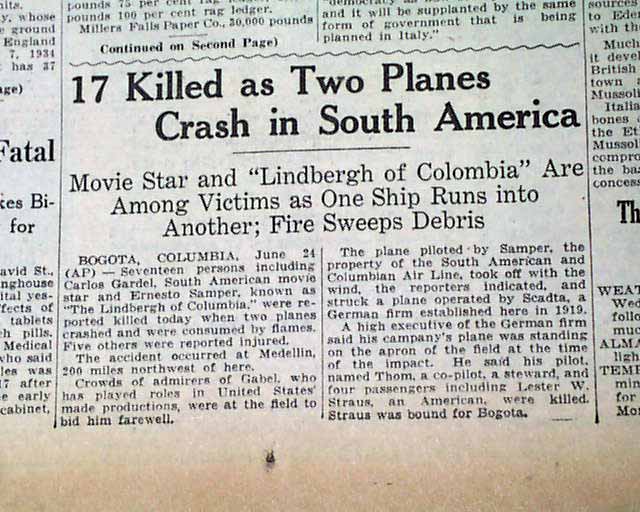 background: This edition of The Springfield Union serves as a somber time capsule, capturing the immediate global shock following the June 24, 1935, runway collision in Medellín that claimed the life of the "King of Tango," Carlos Gardel. While the report is tucked into a two-column spread near the bottom of the front page—typical for international news in a regional Massachusetts paper of that era—the "17 Killed" headline masks the immense cultural weight of the tragedy, which saw the loss of not only Gardel but also his lyricist Alfredo Le Pera and several musicians. The 18-page complete issue provides a fascinating juxtaposition of 1930s Americana against this seismic event in Latin American history; the light toning and minor margin wear are characteristic of the high-acid wood pulp paper used during the Great Depression, yet the completeness of the specimen makes it a desirable artifact for both aviation historians and musicologists.