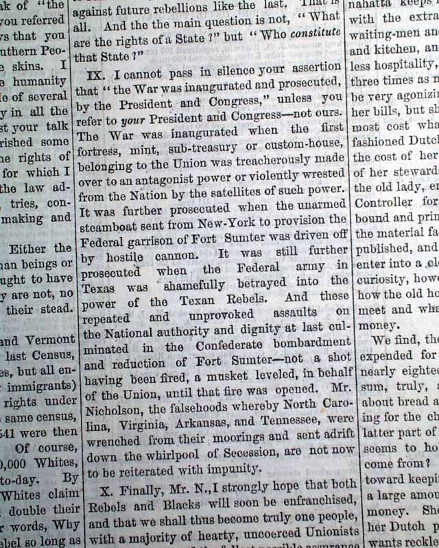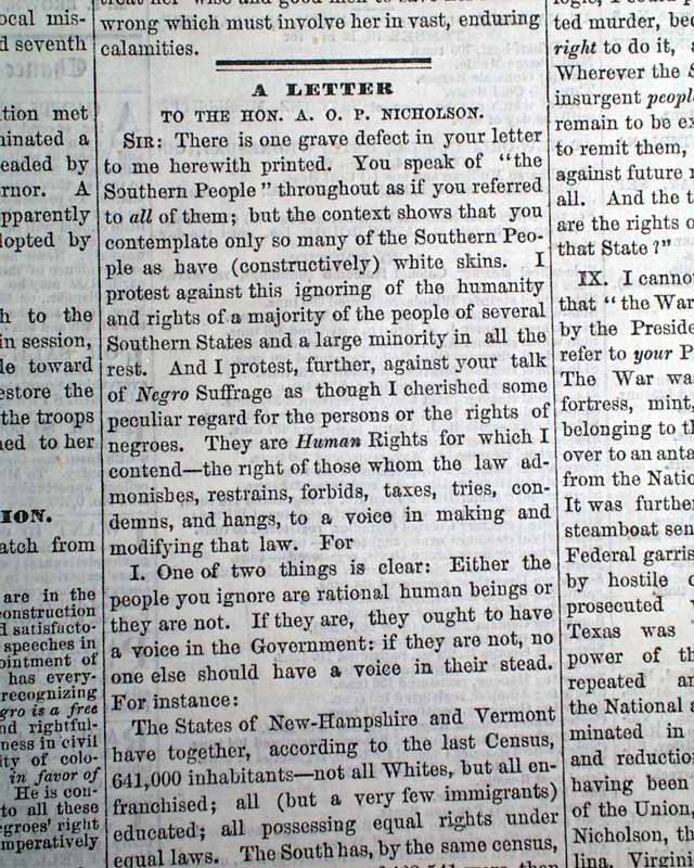 Background: Greeley's letter serves as a vital primary source from the dawn of the Reconstruction Era. As the influential editor of the North’s most widely read newspaper, Horace Greeley used this exchange with A.O.P. Nicholson to dismantle the "scientific" and social prejudices used to justify the disenfranchisement of formerly enslaved people.