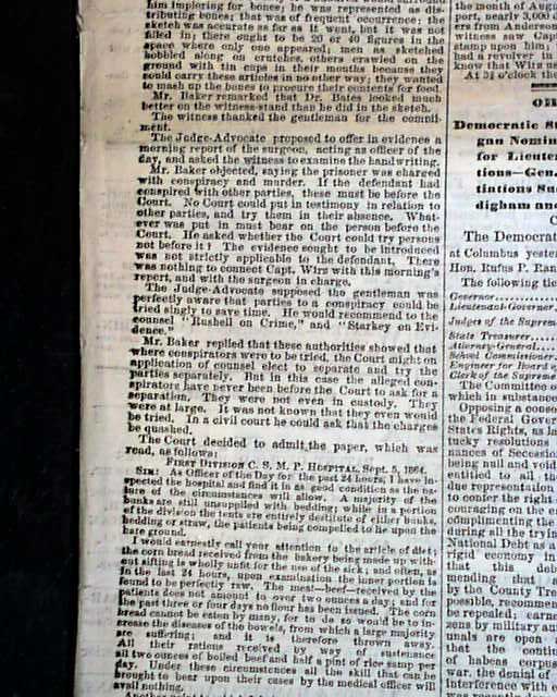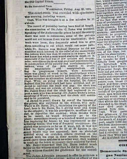 Additionally, the top of the front page has one column headings: "Andersonville" "The Trial of Wirz" "Dr. Bates Testimony Resumed" "Evidence of a Loyal Physician" "Sickening Details of Rebel Barbarities" "A Prisoner Killed by a Bloodhound" "Wirz Knocks a Man Down & Stamps on Him".