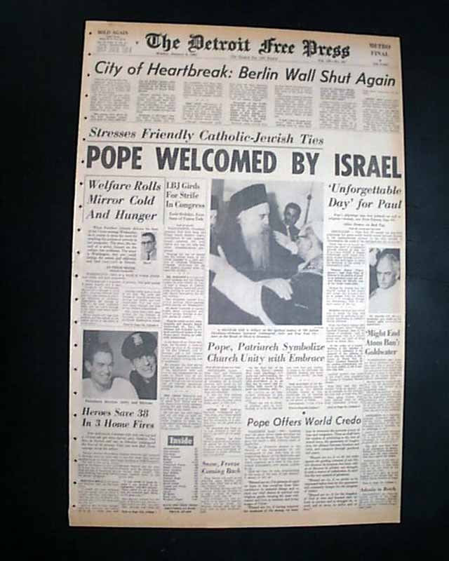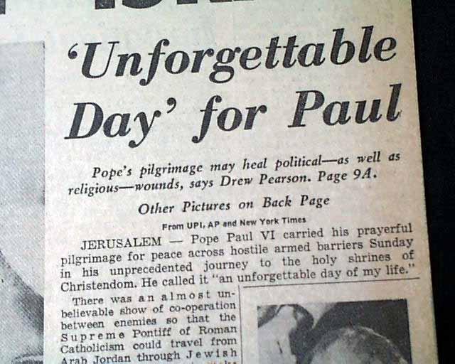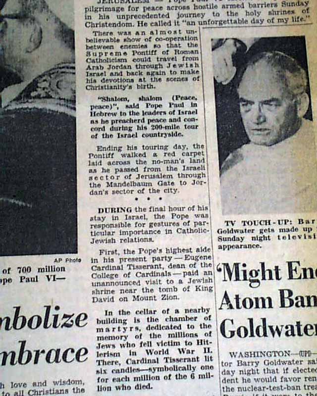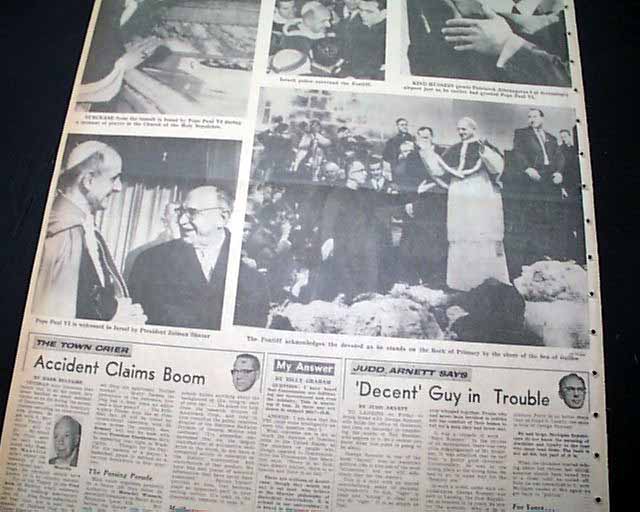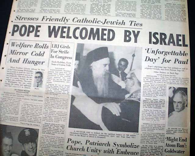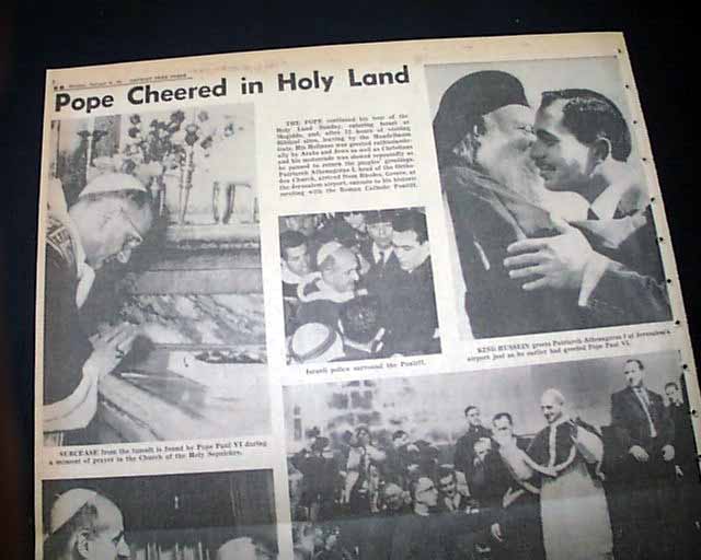 The front page has a nice banner headline: "POPE WELCOMED BY ISRAEL" with lead-in: "Stresses Friendly Catholic-Jewish Ties", subhead and related photo. (see images) More inside and related pictorial on the back page.