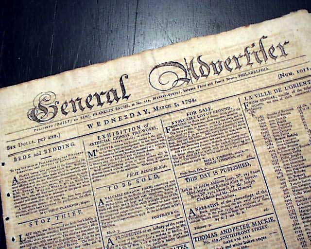 GENERAL ADVERTISER, Philadelphia, March 5, 1794  The capital of the United States was in Philadelphia at this time while the District of Columbia was under construction.