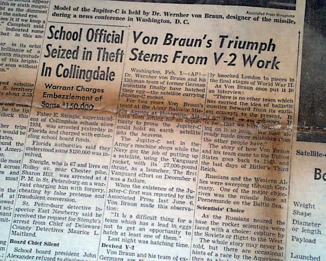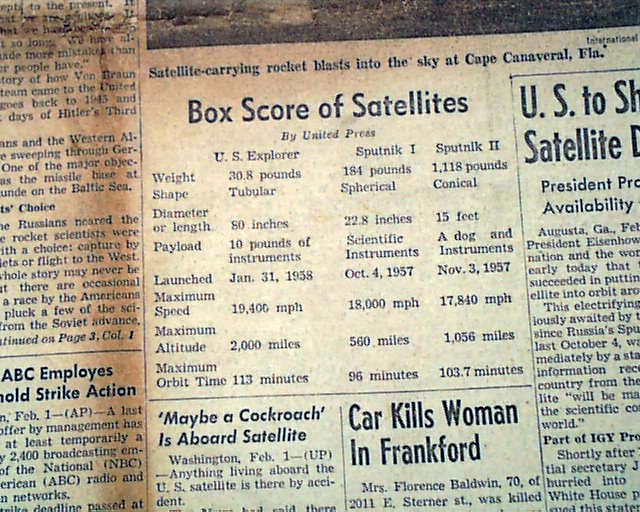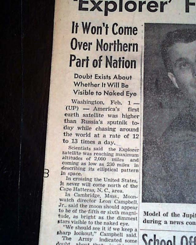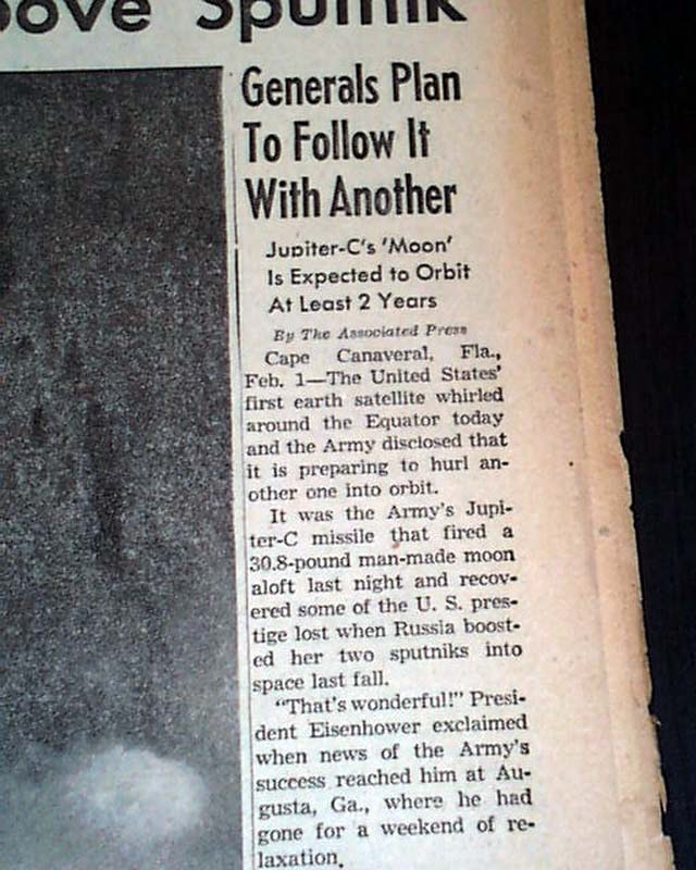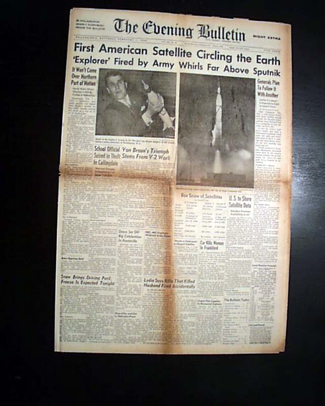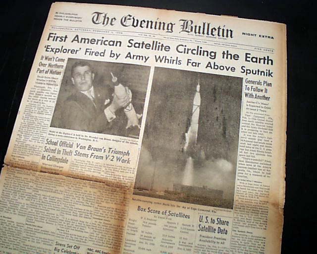 THE EVENING BULLETIN, Philadelphia, Feb. 1, 1958  The front page has a banner headline announcing America's successful entry in the space race with: "First American Satellite Circling the Earth" " 'Explorer' Fired by Army Whirls Far Above Sputnik" with related subheads.