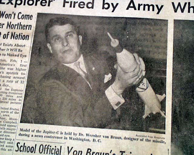 The ftpg. also has two photos, one of the lift--off at Cape Canaveral, and the other of Dr. Wernher von Braun holding a model of the Jupiter-C missile.