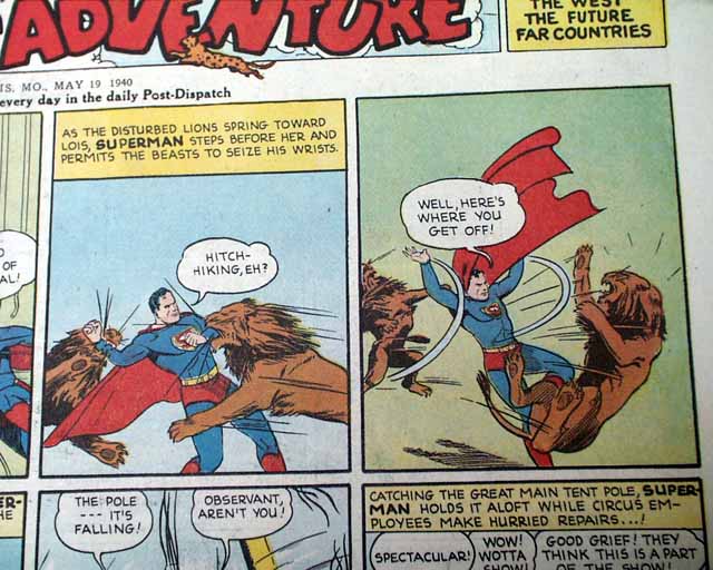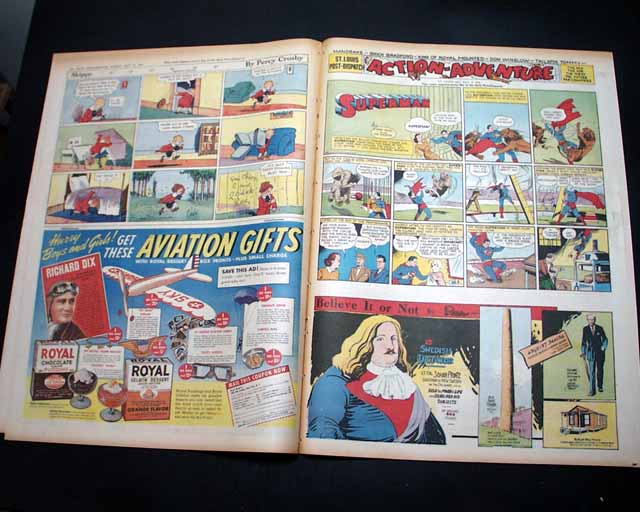 Inside is Superman strip #29 with the artwork by Joe Shuster. Included is not just the Superman strip by the entire 16 page color comic section of the St. Louis Post-Dispatch dated May 19, 1940, containing many color comics.