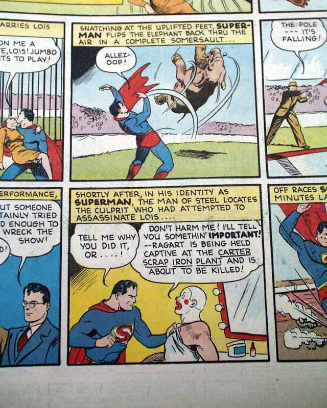 background: In the May 19, 1940, Sunday strip (#29), Superman finds himself in the middle of a chaotic scene at a traveling circus where a massive elephant has broken free and a pair of lions are on the prowl, threatening the panicked spectators. As the massive pachyderm charges, Superman demonstrates his early Golden Age power by catching the beast by its tusks, holding his ground as the ground shakes, and physically steering the giant animal back toward its enclosure. Simultaneously, he has to contend with the escaped lions; in one iconic sequence of panels, he effortlessly snatches a leaping lion out of mid-air with one hand and tosses it back into its cage, all while Lois Lane scrambles to document the narrow escapes for her next scoop. The strip perfectly captures the "strongman" era of the character, focusing on his role as a protector of the public against immediate, visceral dangers rather than cosmic villains.