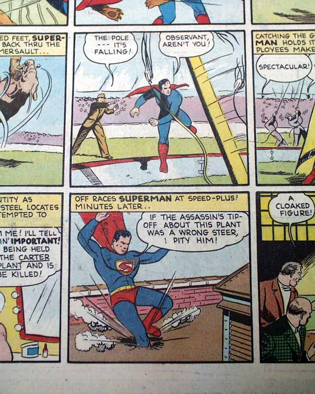 This is a first year printing of the "Superman" color comic strip (by Jerry Siegel and Joe Shuster), which began in limited newspapers (through the McClure Newspaper Syndicate) on November 5, 1939 (a daily, black & white comic began on January 16). The weekly color Superman strip had a story-line continuity which was separate from the daily comic. At its peak the color comic appeared in 90 Sunday papers with a readership of over 90 million.