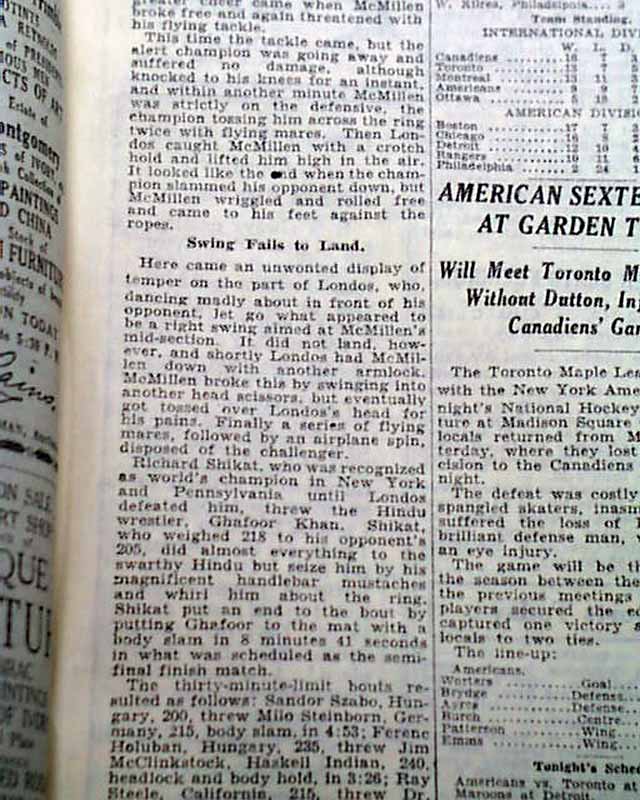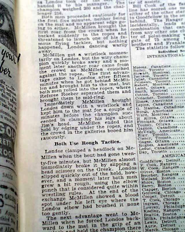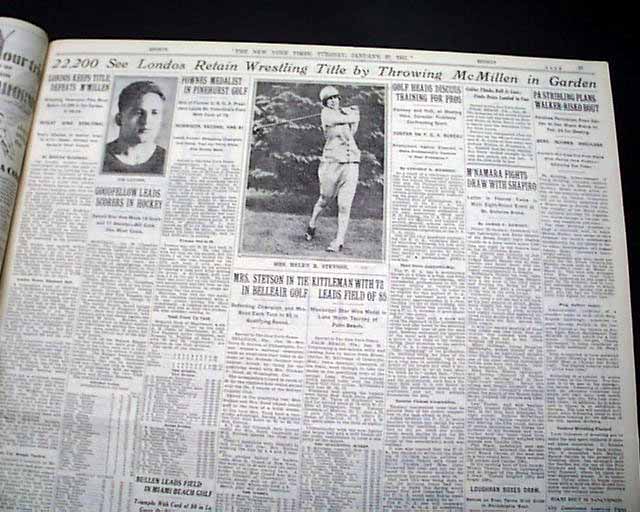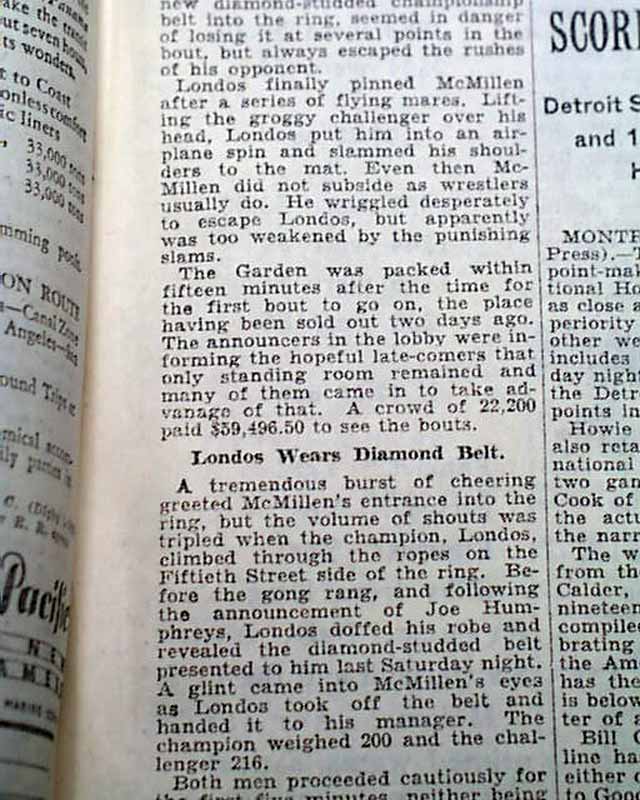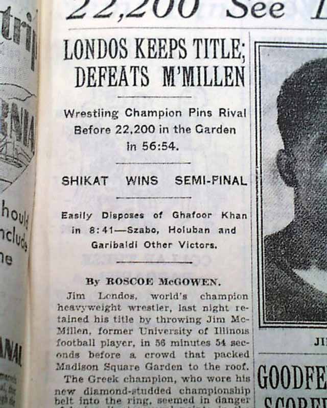 The top of page 27 has a banner headline: "22,200 See Londos Retain Wrestling Title by Throwing McMillen in Garden" with subheads and photo of Londos. (see images)