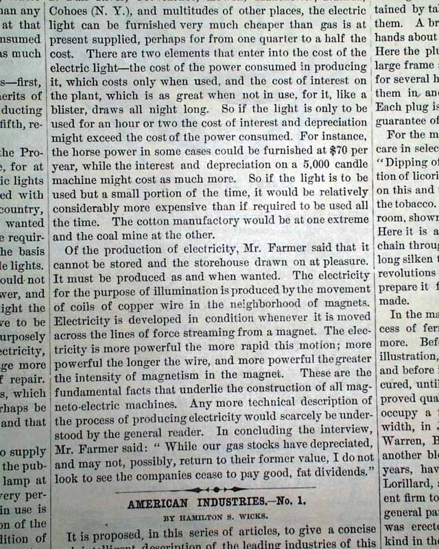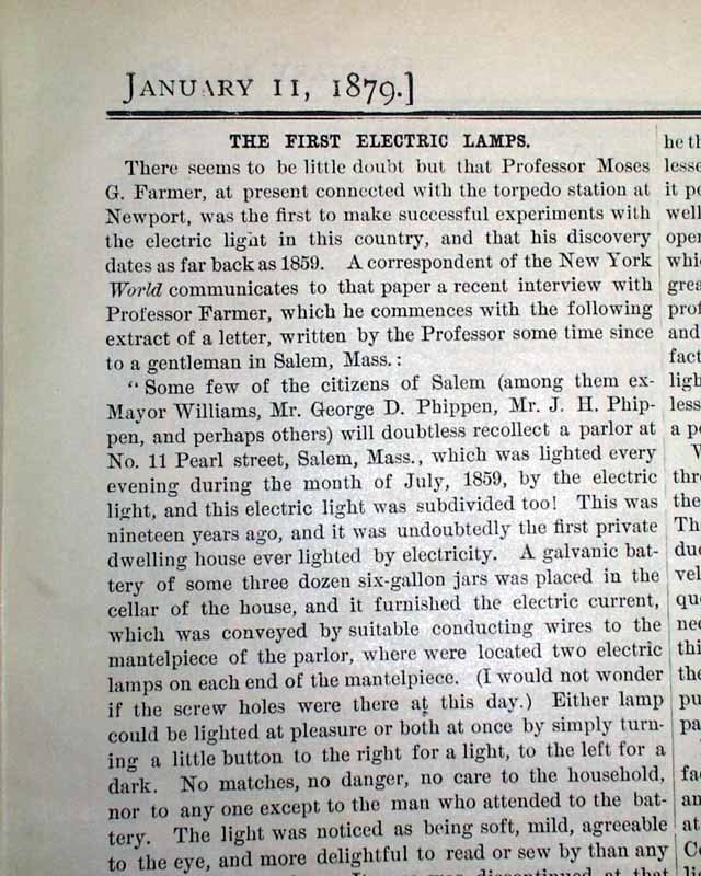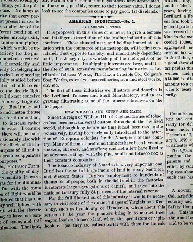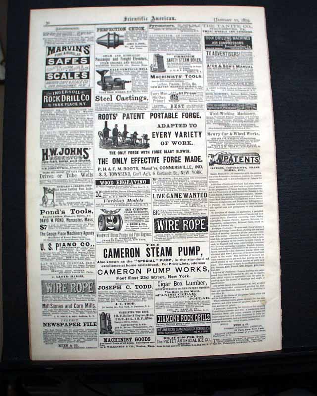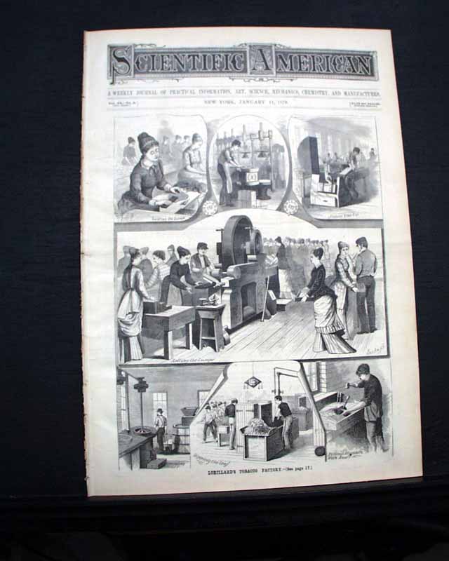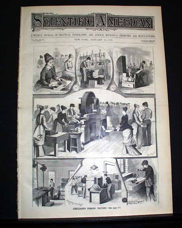 SCIENTIFIC AMERICAN, New York, January 11, 1879 The front page has various scenes from inside a Tobacco Factory. Inside contains images and text re: "A Three Legged Woodcock", "...The Tanks of the Brighton Aquarium", "The Chichester Water tower", and more. Period advertising is present throughout.