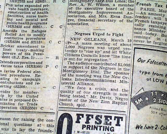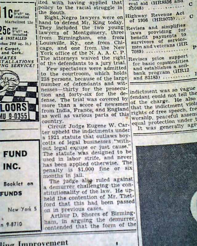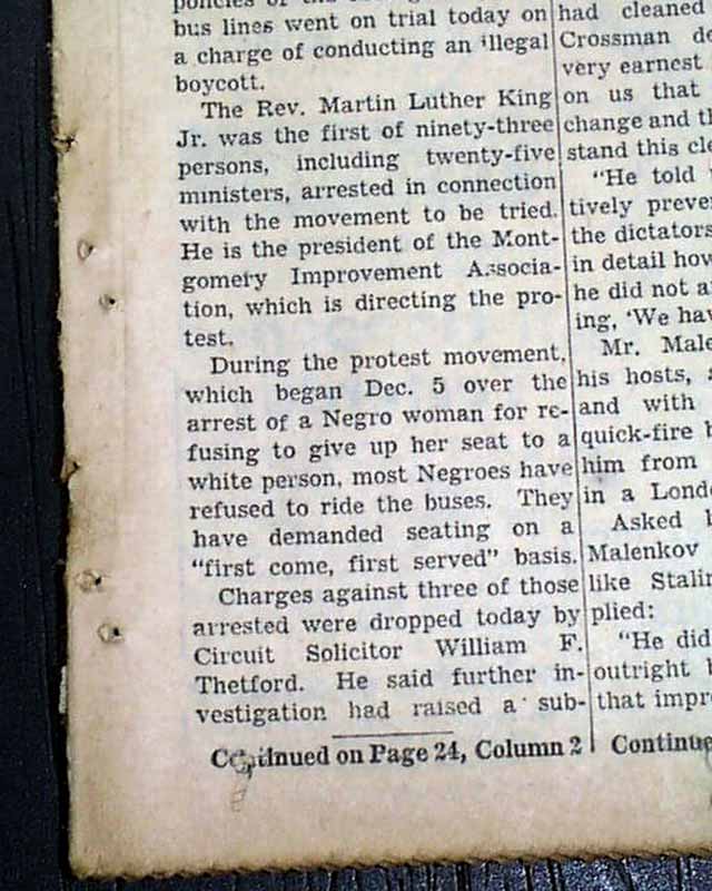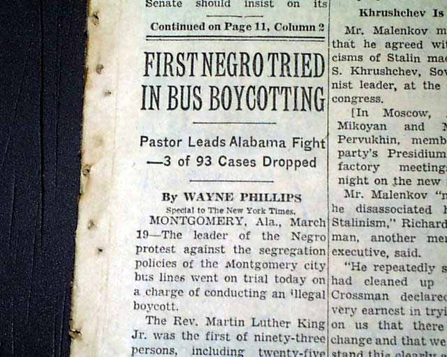 The front page has a one column heading: "FIRST NEGRO TRIED IN BUS BOYCOTTING" with subhead. (see images)