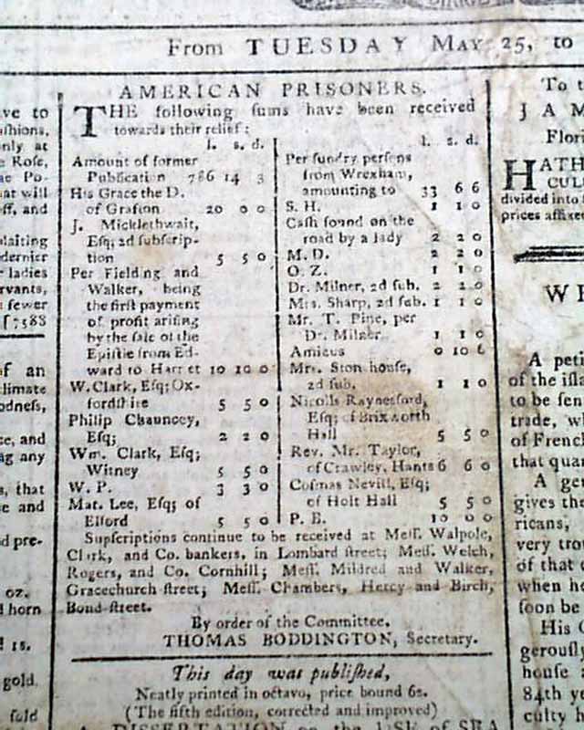 I could find no "meaty" references to the Revolutionary War in this issue except for a front page list of "American Prisoners" (see images)