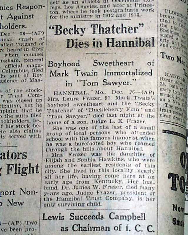 Page 4 has a one column heading: "'Becky Thatcher' Dies in Hannibal" with subhead. (see images)