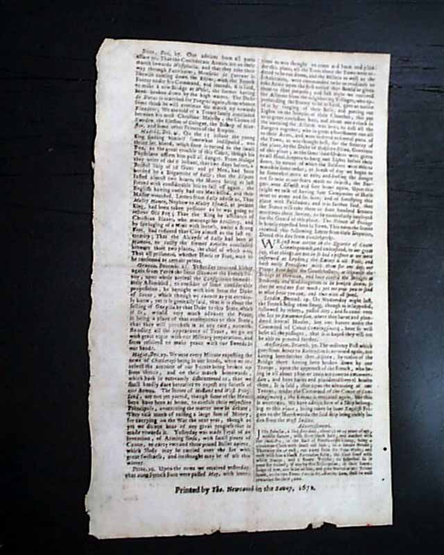 The issue is filled with various news of the day from various cities in Europe, each report with its own dateline, and even includes a few "Advertisements" on the back page. Given its small size this would be a nice newspaper for framing & display with the 352 year old date prominent at the top. Very light, minor foxing, a few tiny tears along the right, blank margin, generally in very nice condition.