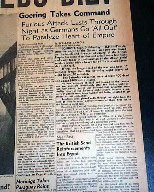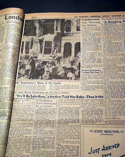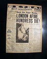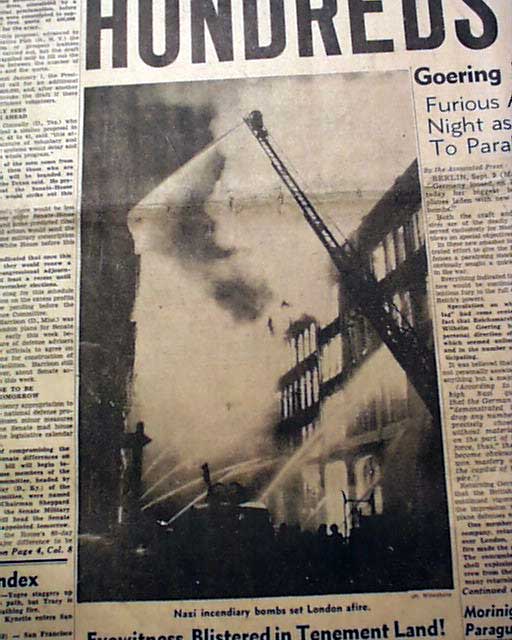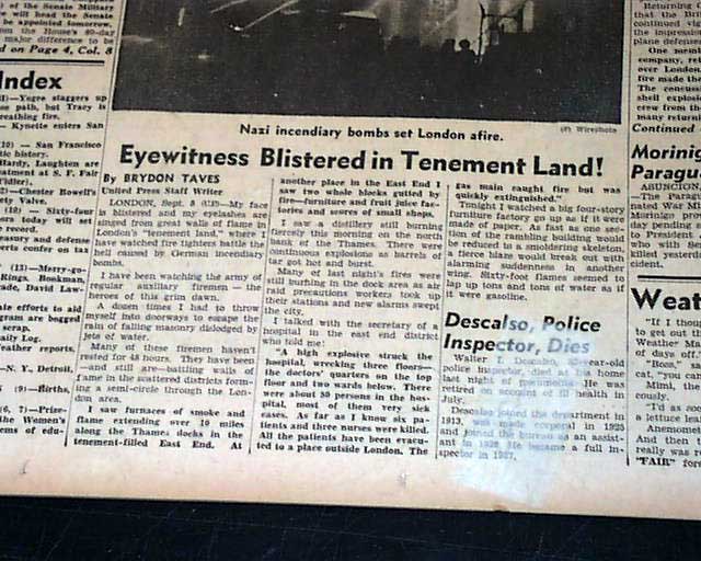 The front page has a nice headline: "LONDON AFIRE, HUNDREDS DIE!" with lead-in: "Nazis Use Super Bombs--", subheads and related photo. (see images) Nice for display. More inside.