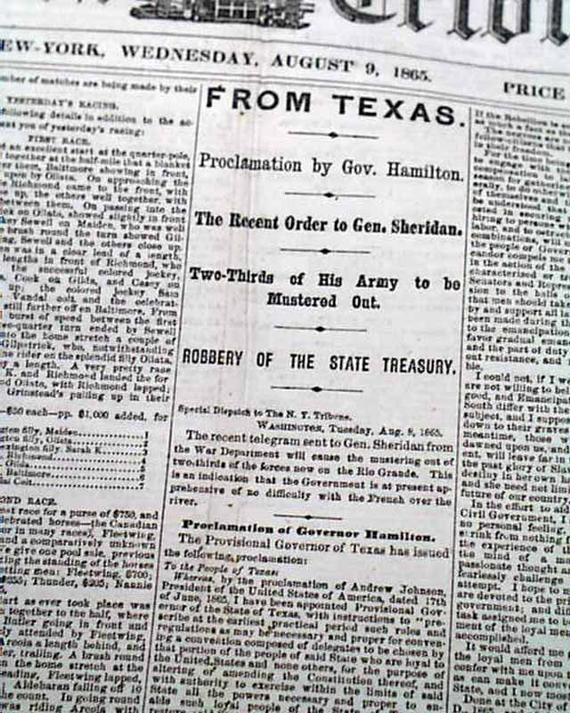 The front page column heads include: "FROM TEXAS" "Proclamation by Gov. Hamilton" "Recent Order to Gen. Sheridan" "Two-Thirds of His Army to be Mustered Out" "SARATOGA RACES" "The Cup Won by Kentucky" and much more. The back page has a report of a baseball game, with the box score.