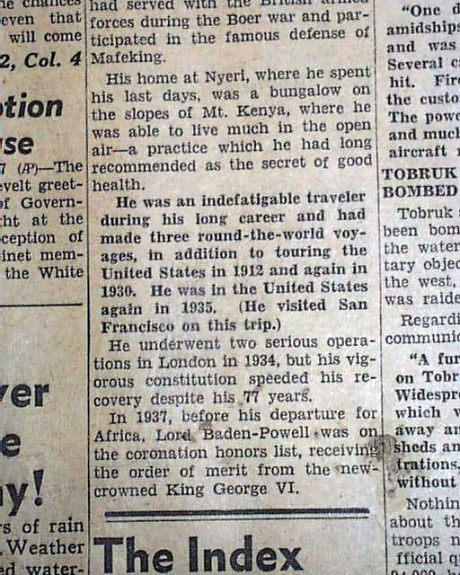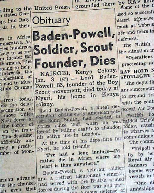 The front page has a one column heading: "Baden-Powell, Soldier, Scout Founder, Dies" (see images)