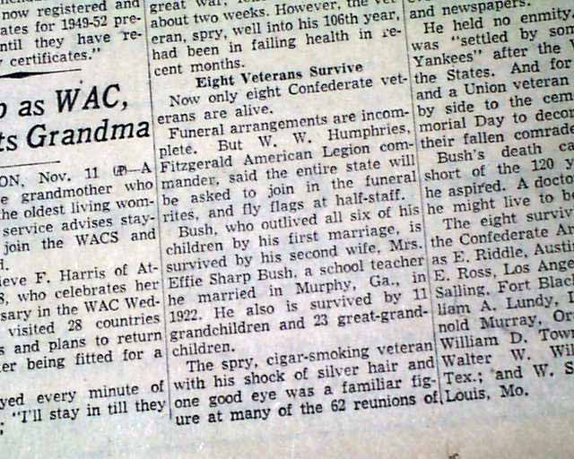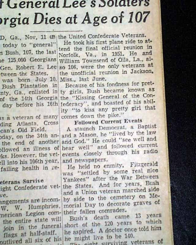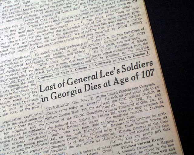 The front page has a two column heading: "Last of General Lee's Soldiers in Georgia Dies at Age of 107" (see images)