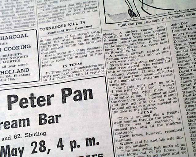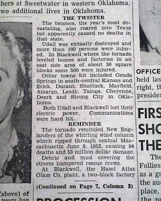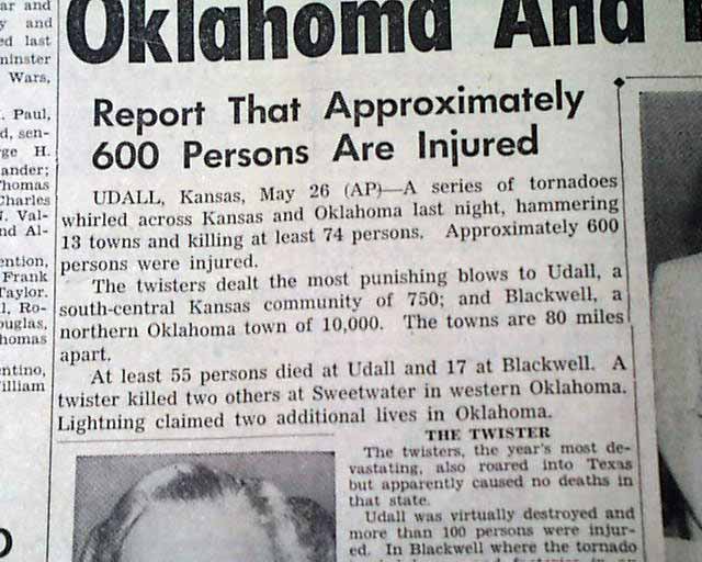 The top of the front page has a five column headline: "Tornadoes Kill 74 As Areas Of Oklahoma And Kansas Hammered" with subhead. (see images)