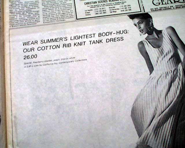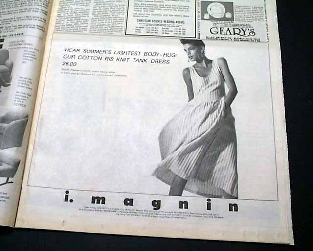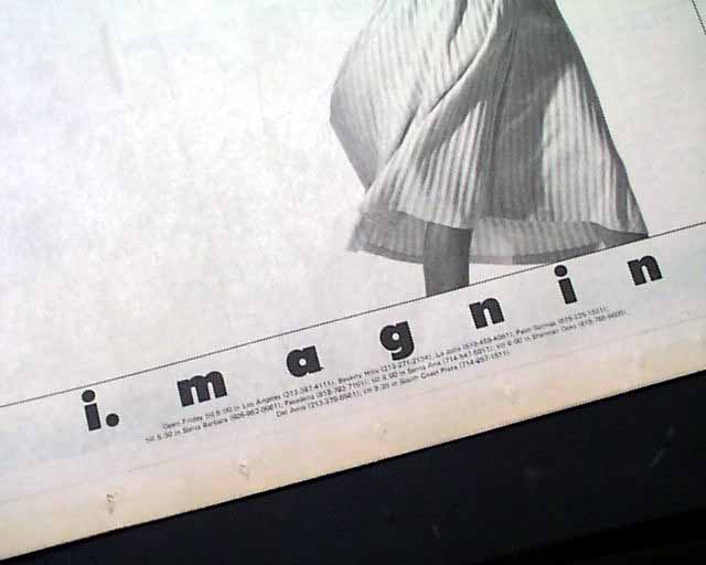 background: This is a remarkably rare find because it captures Cindy Crawford during the exact window of 1985 when she was transitioning from a Midwestern college student to a professional model, just months before she moved to New York and ignited the "Supermodel" phenomenon of the late '80s. While 1990s covers are relatively easy to find, 1985 regional newspaper advertisements like this are significantly rarer because newspapers were printed on high-acid paper intended to be thrown away the next day, unlike glossy magazines which people tended to archive. Furthermore, this ad represents a "lost" era of California luxury; I. Magnin was the West Coast’s premier high-end retailer—often called the "Bergdorf Goodman of the West"—and since the chain was liquidated in 1994, original print marketing featuring their iconic branding has become a niche collectible. Finding a pristine page from the Los Angeles Times that pairs one of the world's most recognizable faces with a defunct titan of fashion retail makes this a "holy grail" for collectors of 1980s ephemera.
