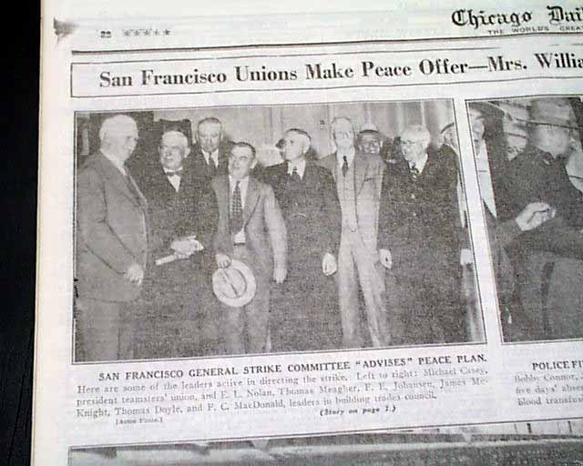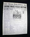 The front page has a banner headline: "UNIONS MAKE PEACE GESTURE" with subheads. (see images) A few related photos are on the back page.